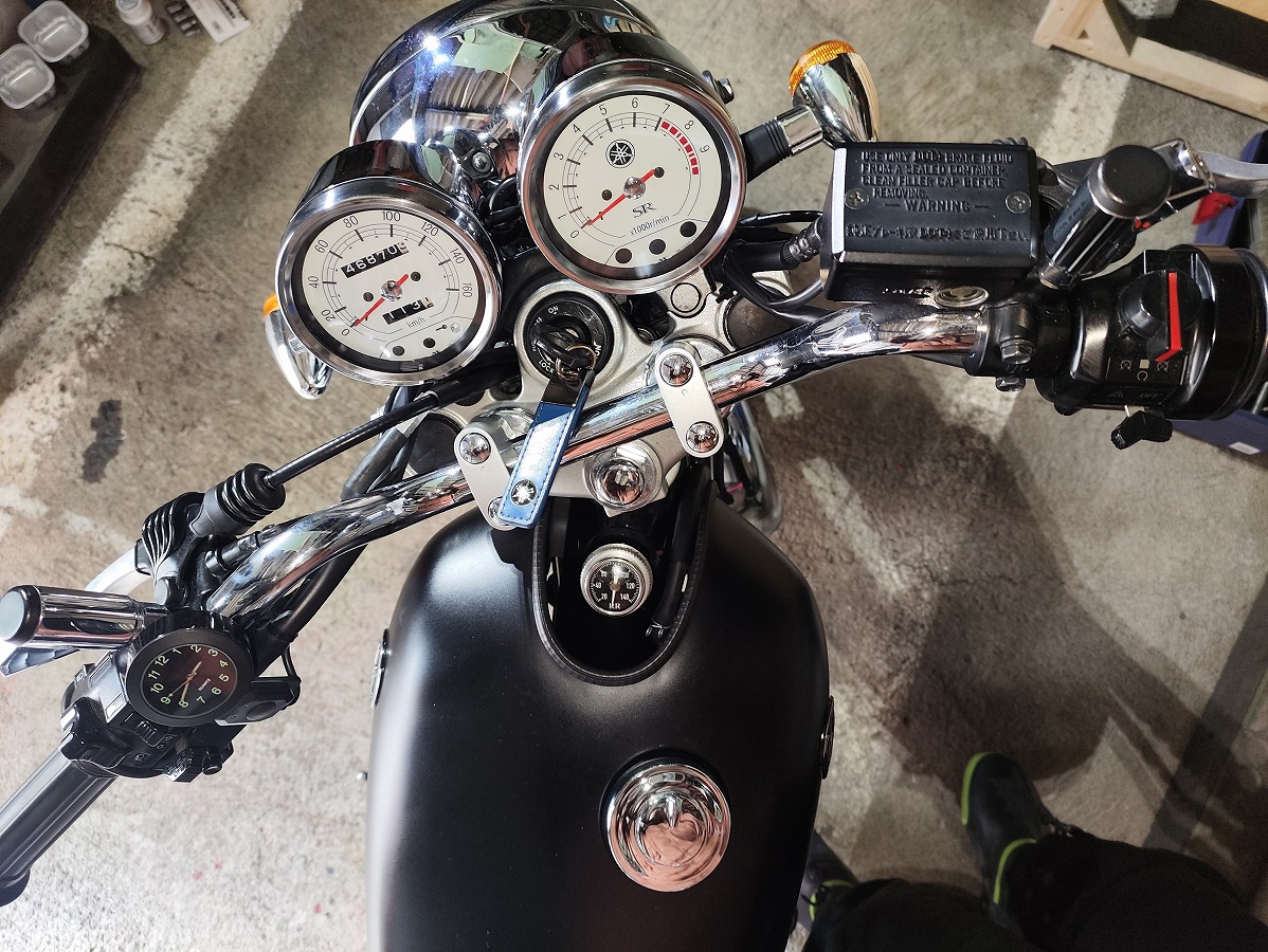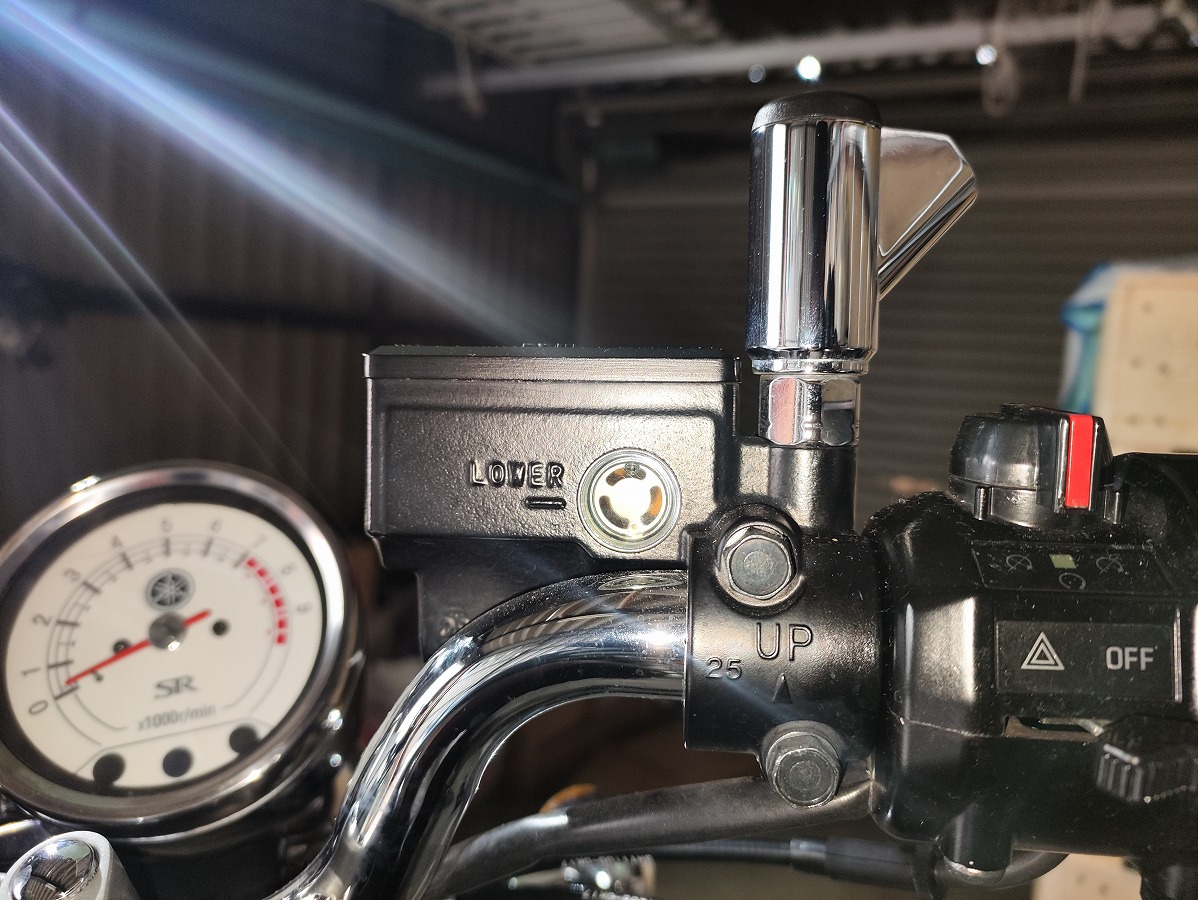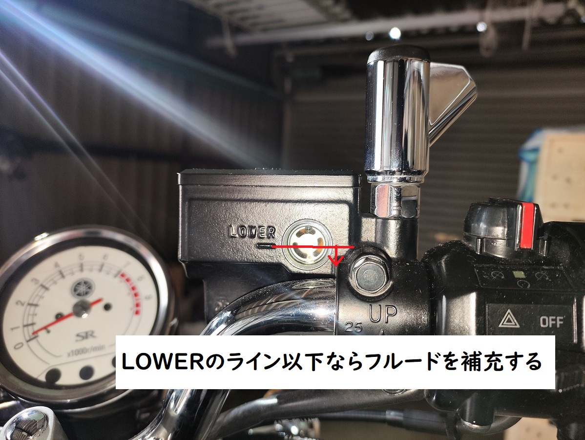 - SR400のフロントブレーキフルードは、ハンドル右側のリザーバータンクの点検窓から確認できます。