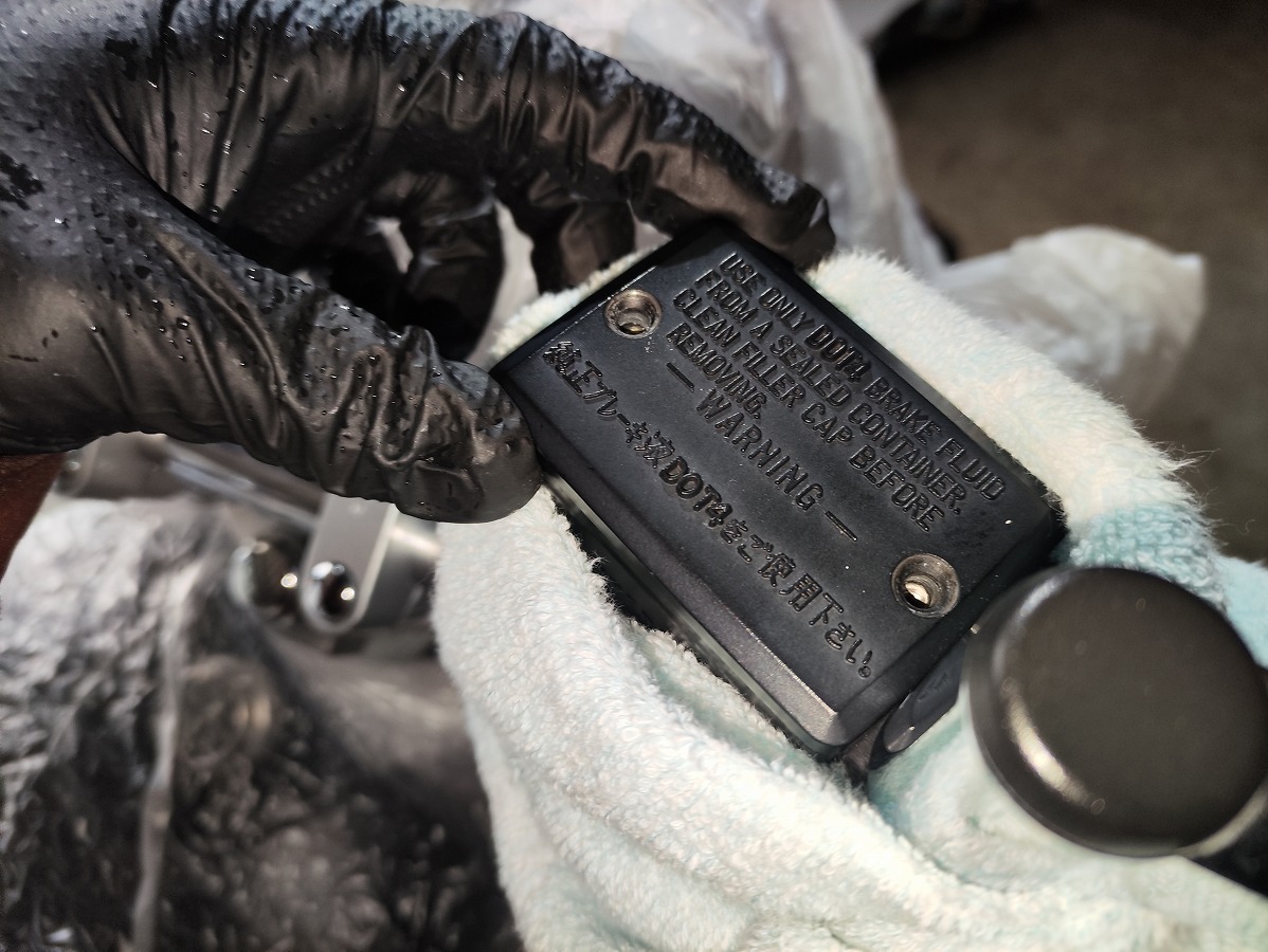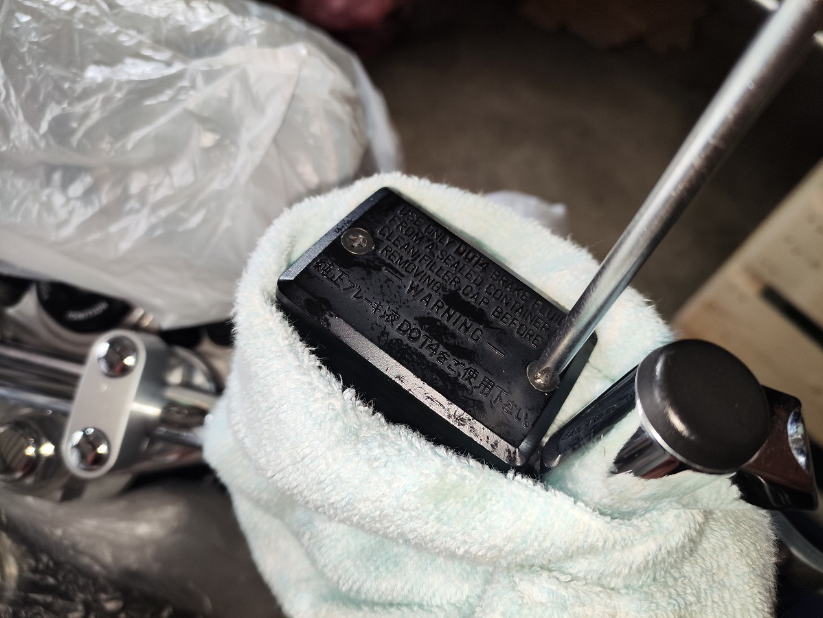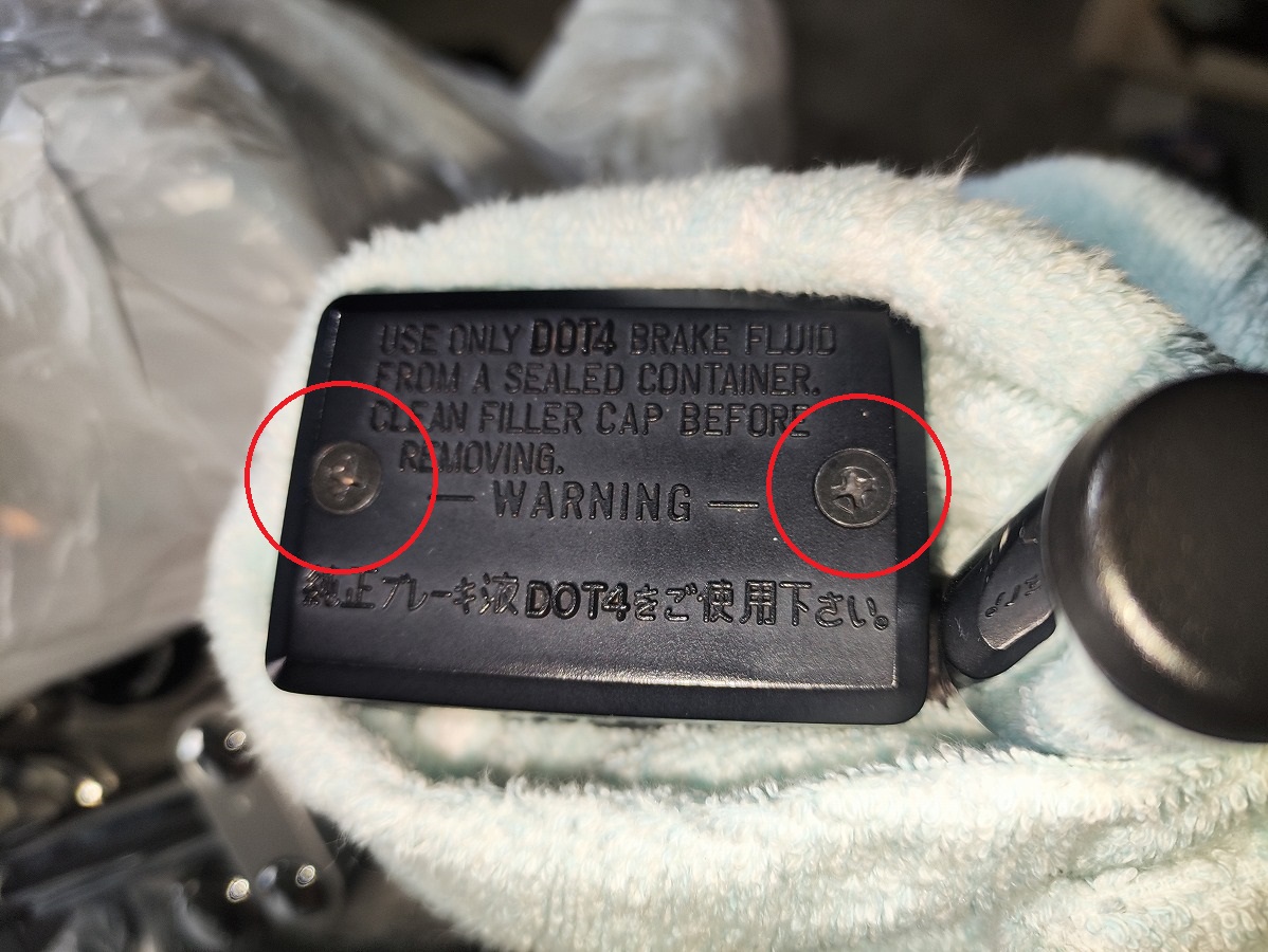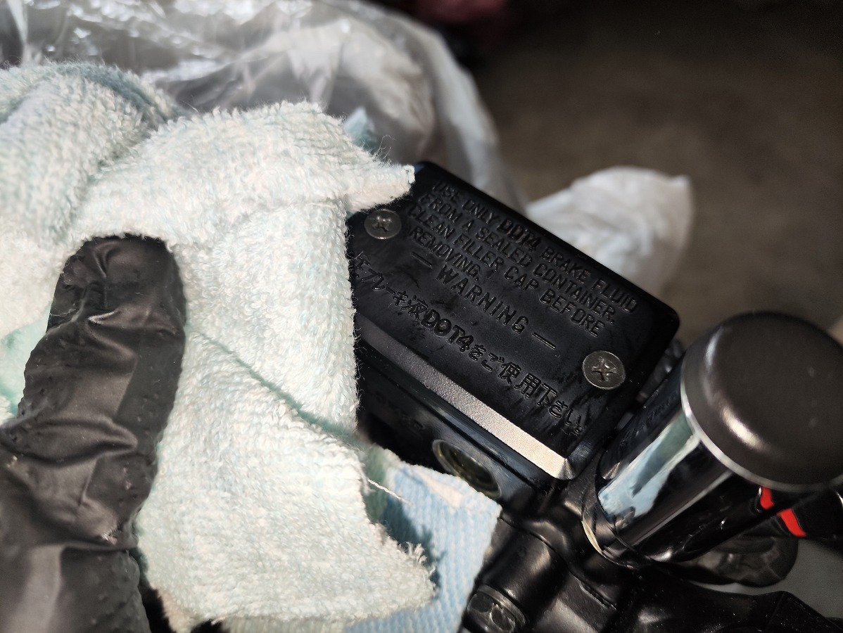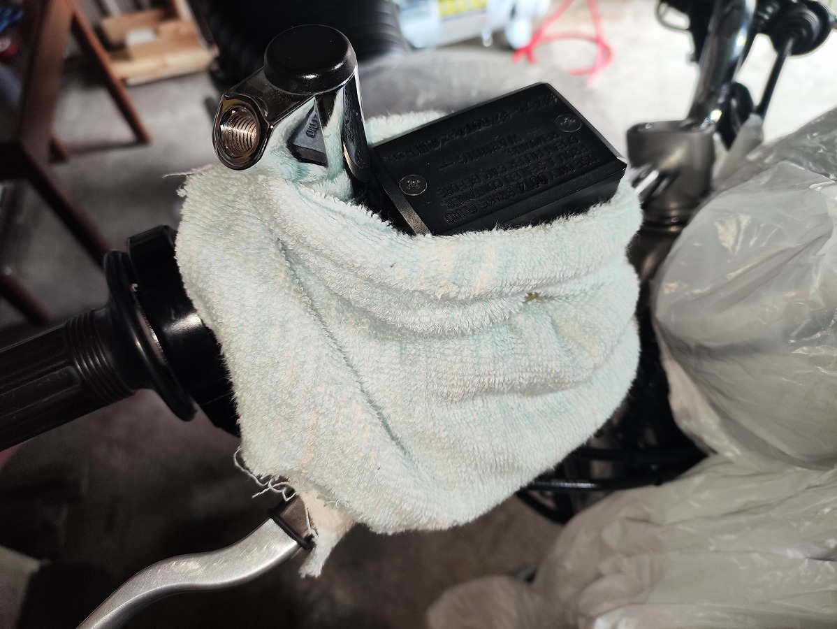 - ブレーキフルードが塗装面に付着すると塗装を傷める恐れがあるため、メーターやライト周辺や燃料タンク、ブリーザータンク周辺をビニール袋やウエスなどで覆い養生する