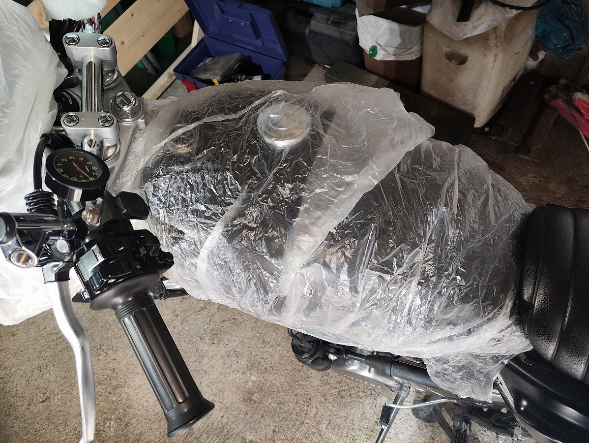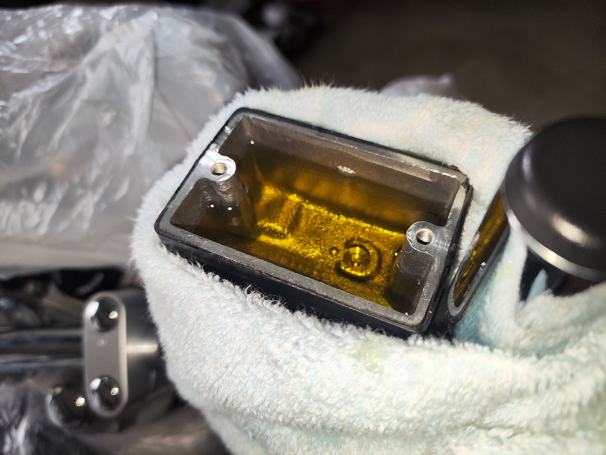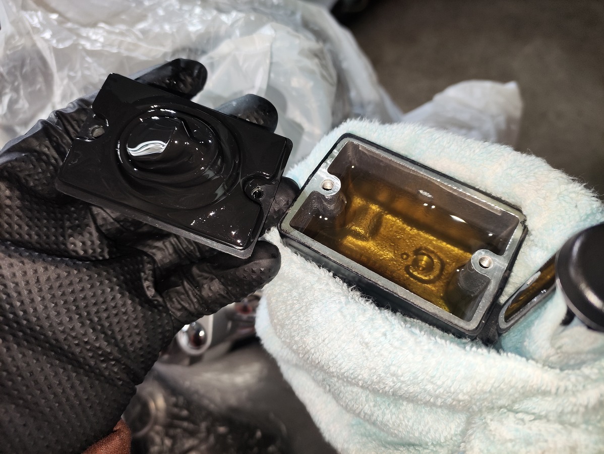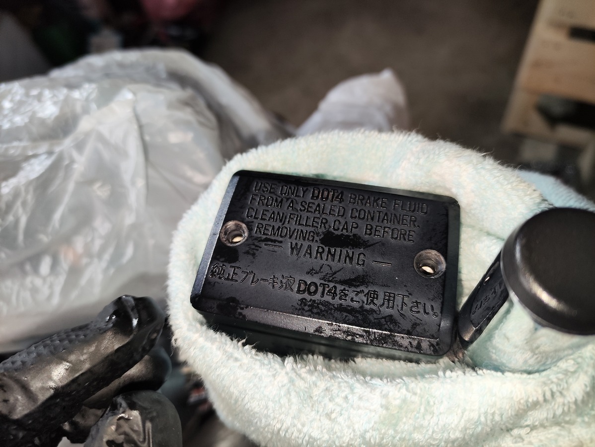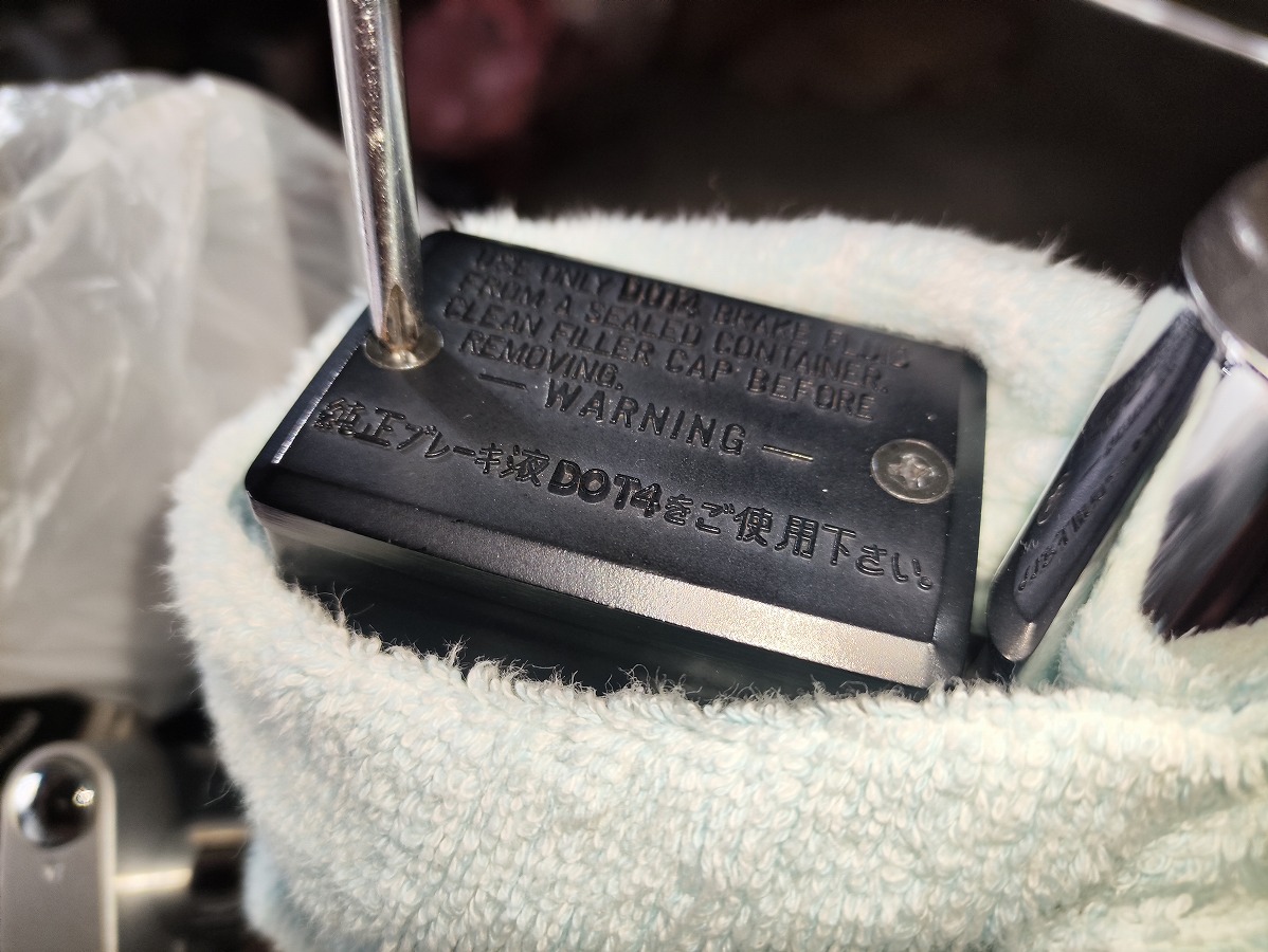 - ブレーキフルードが塗装面に付着すると塗装を傷める恐れがあるため、メーターやライト周辺や燃料タンク、ブリーザータンク周辺をビニール袋やウエスなどで覆い養生する