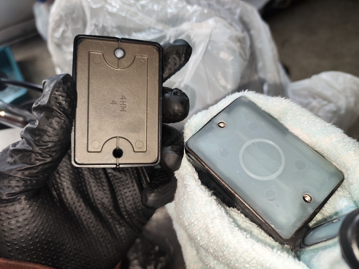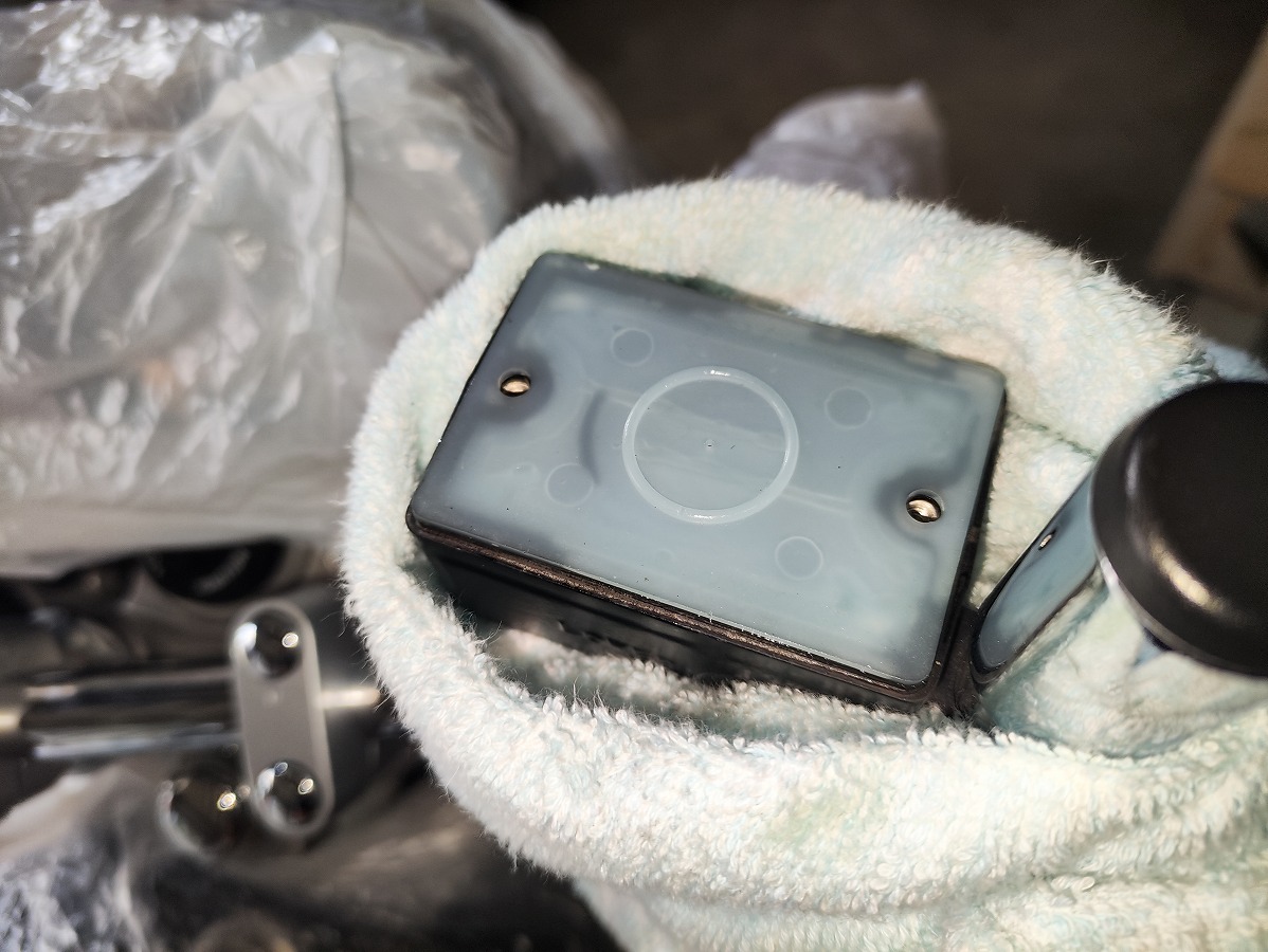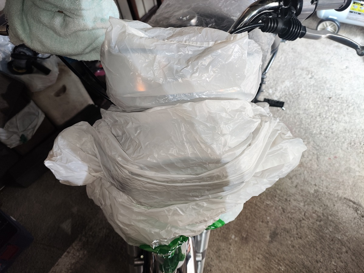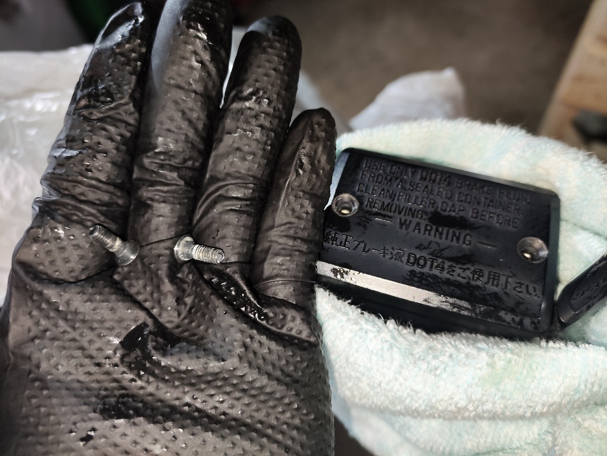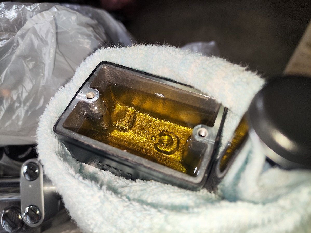 - ブレーキフルードが塗装面に付着すると塗装を傷める恐れがあるため、メーターやライト周辺や燃料タンク、ブリーザータンク周辺をビニール袋やウエスなどで覆い養生する