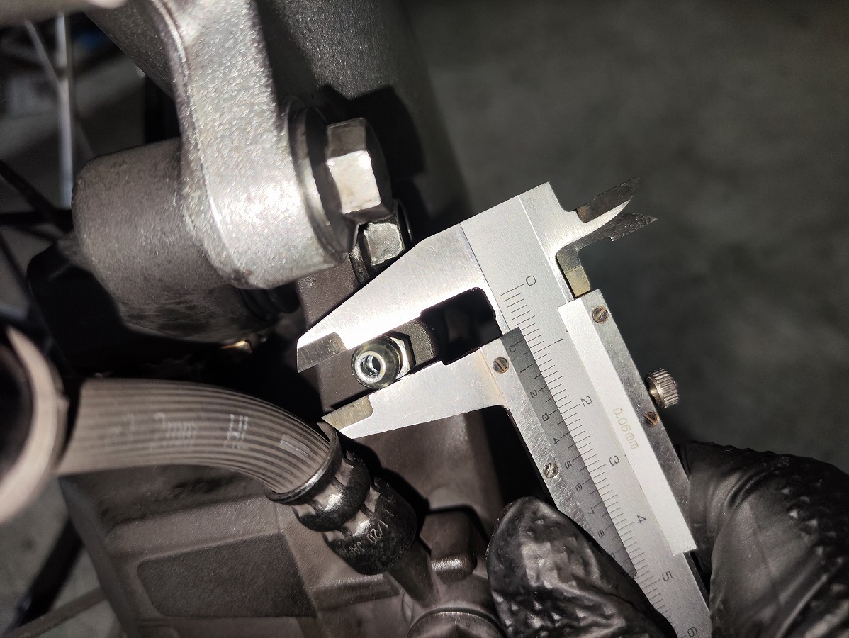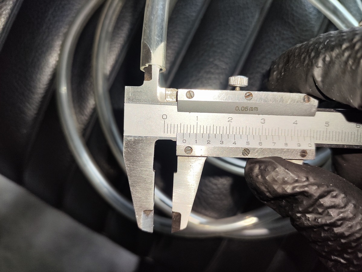 SR400のブリードスクリューのニップル径は約7.4mmです。ホースの内径は素材によってフィット感が異なるため、好みに合わせて用意してください。なお、筆者は手持ちの内径Φ6mmのガソリンホースを使用しました。