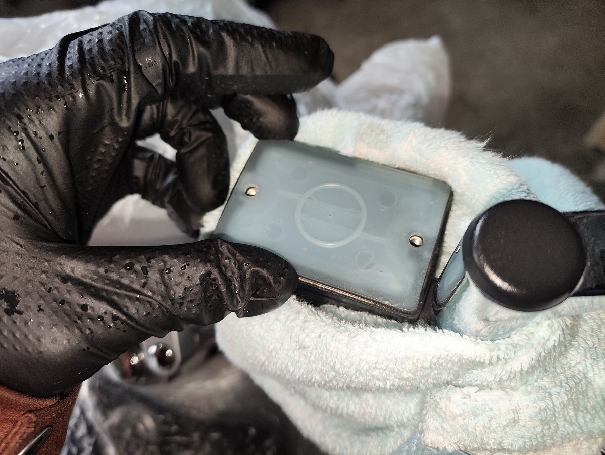 - メーターやライト周辺や燃料タンク、ブリーザータンクなどの養生を取り外し、リザーバータンク周辺をパーツクリーナーなどで清掃