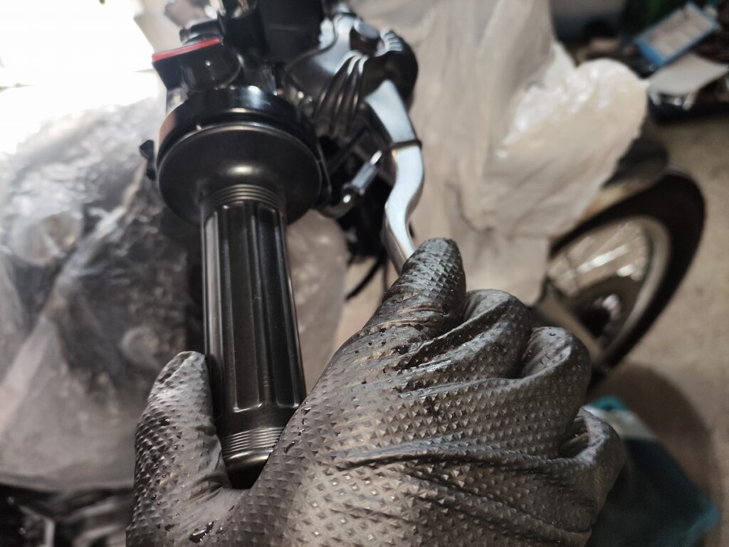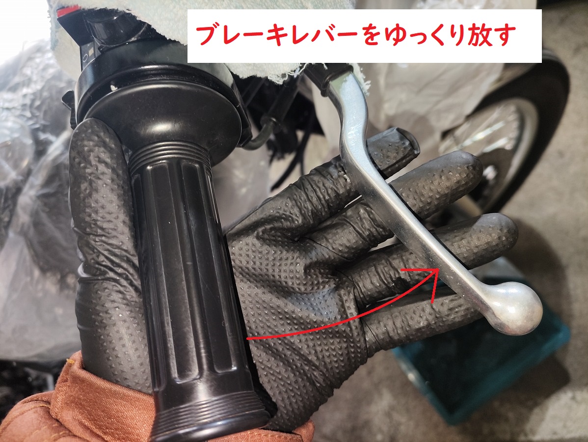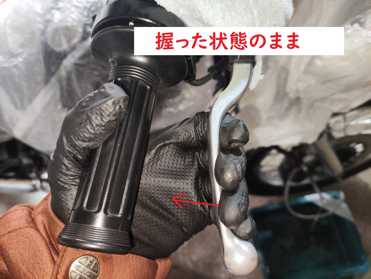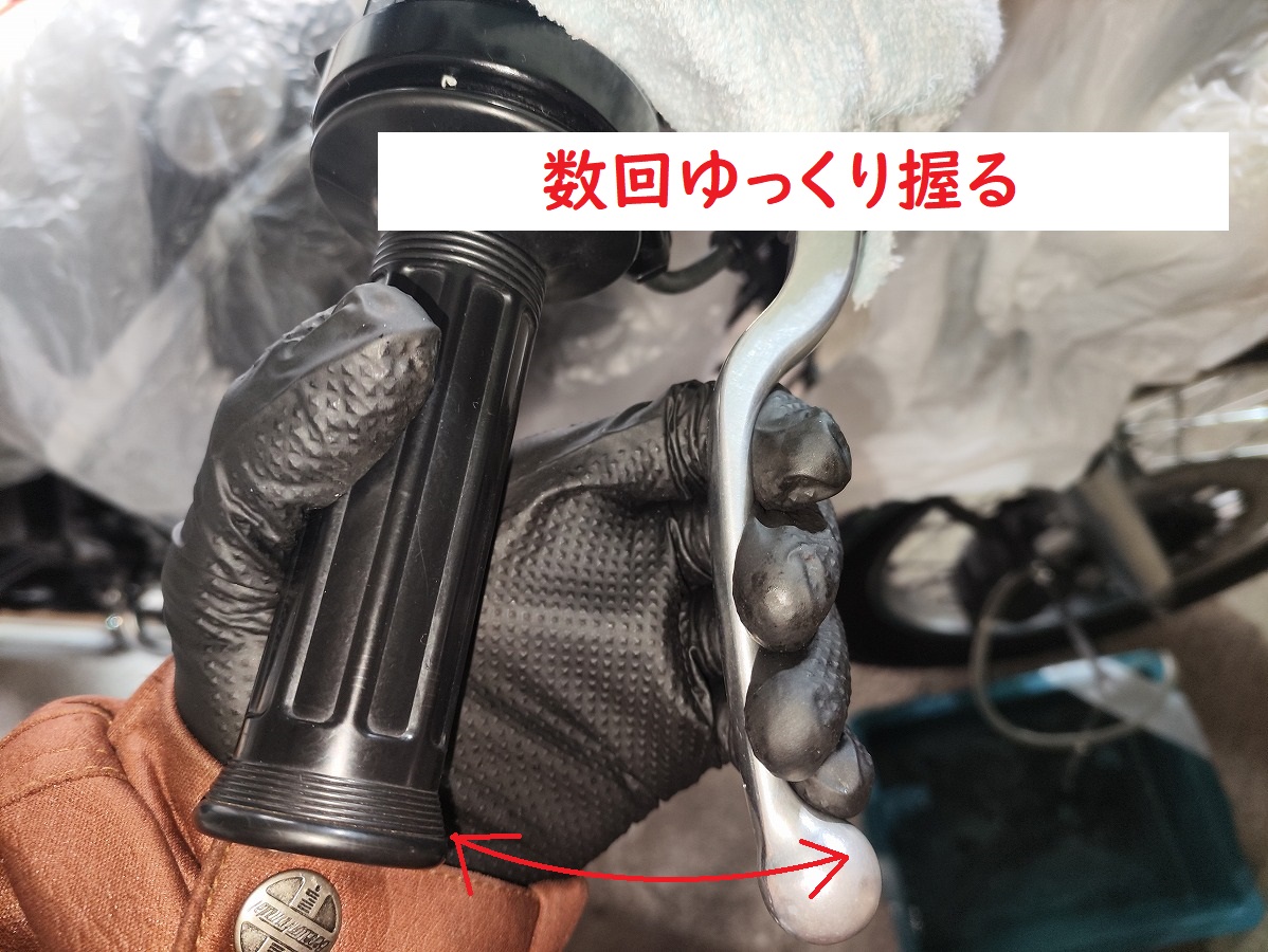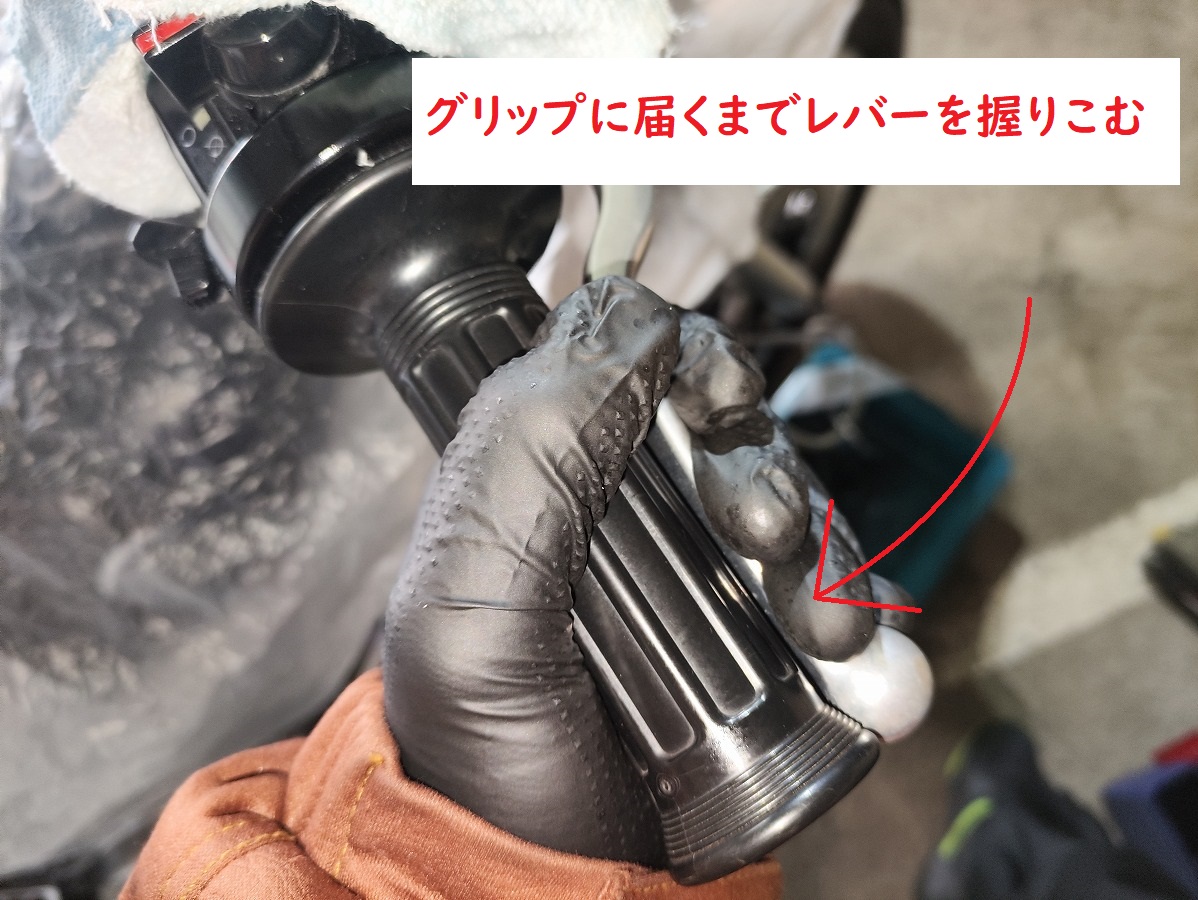 - ③フルードが出てきたら、さらにスロットルグリップまで届くまでレバーを握り込む