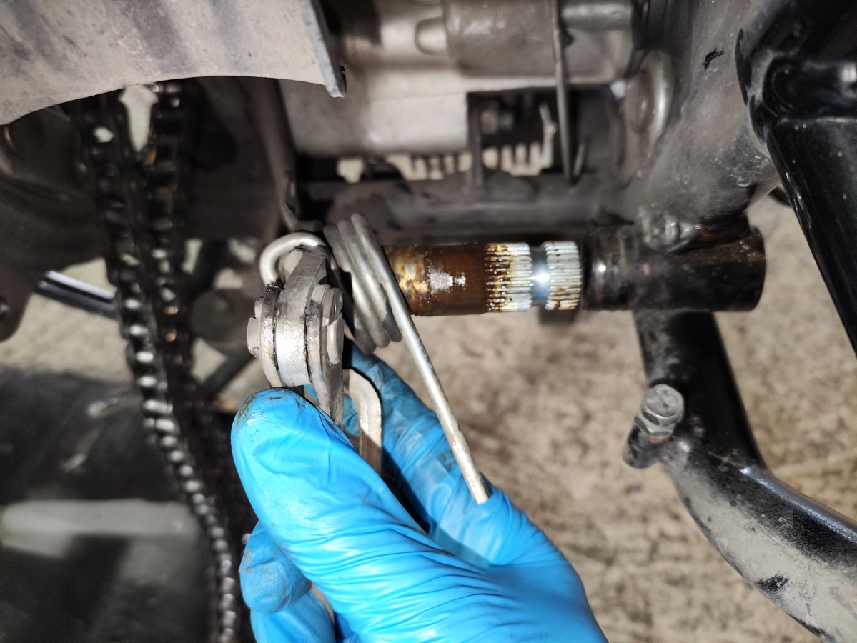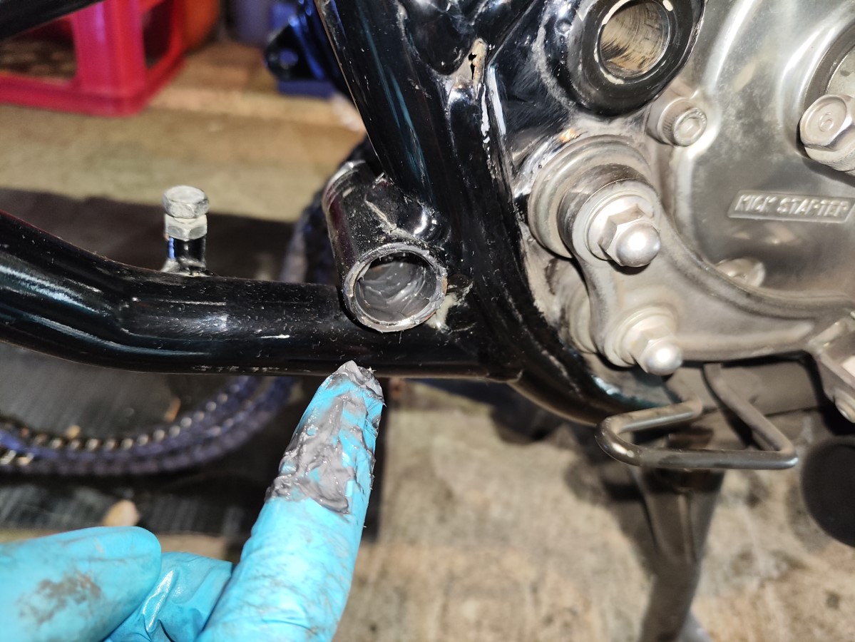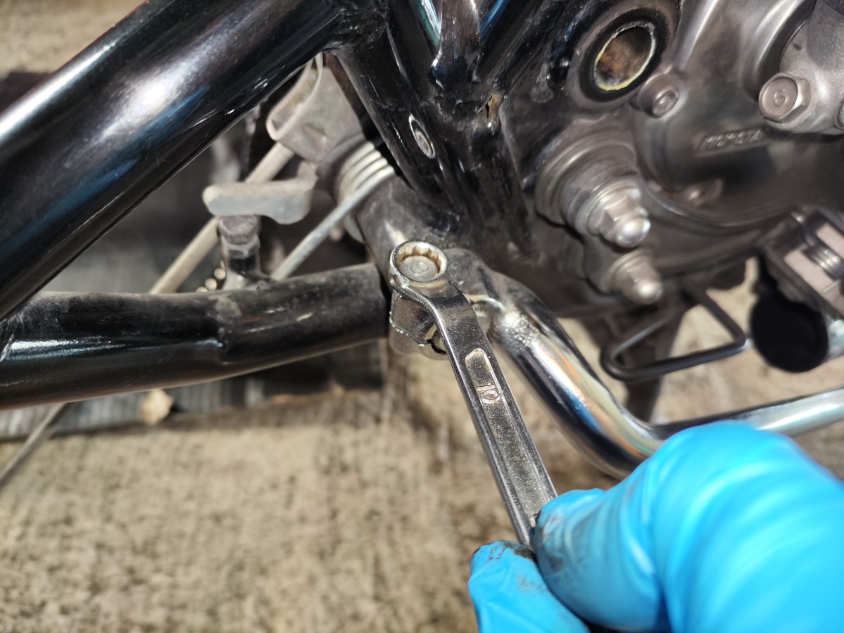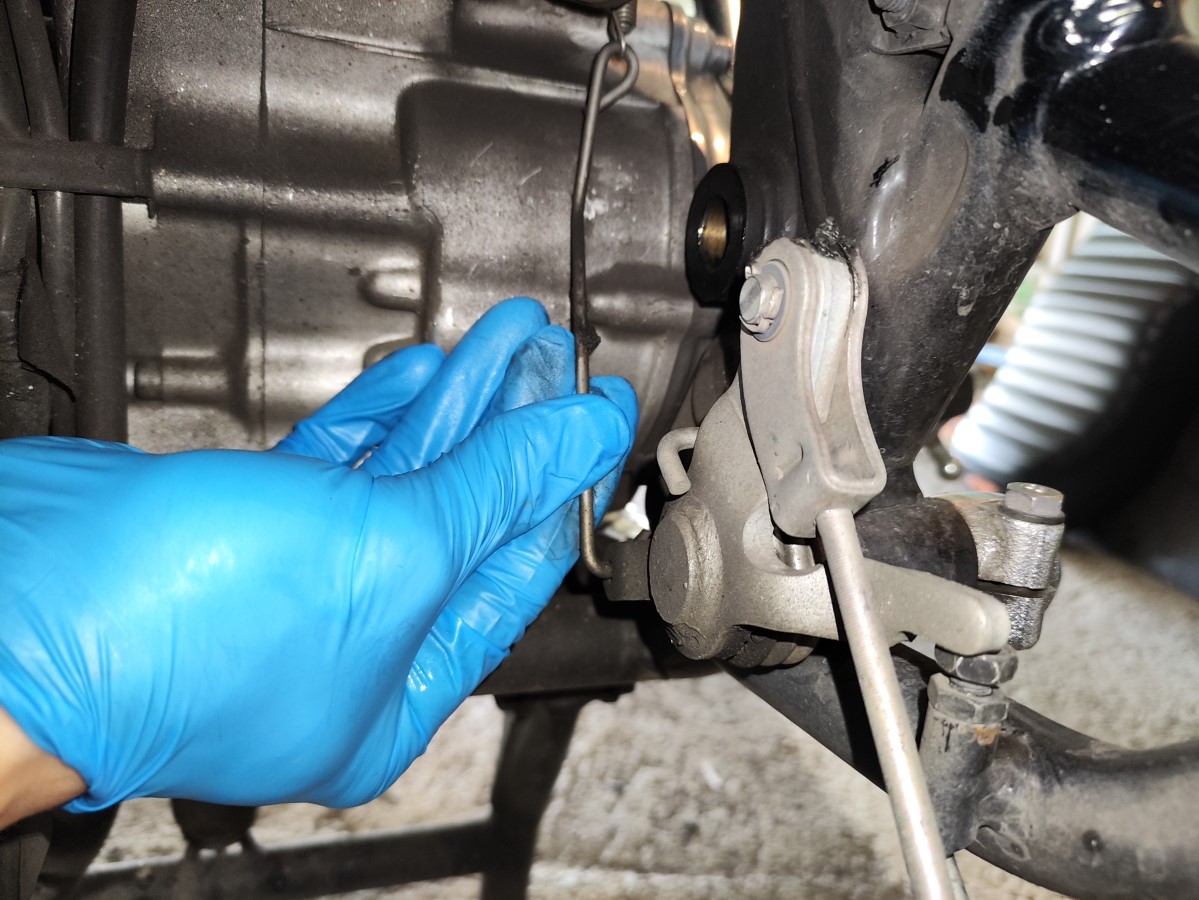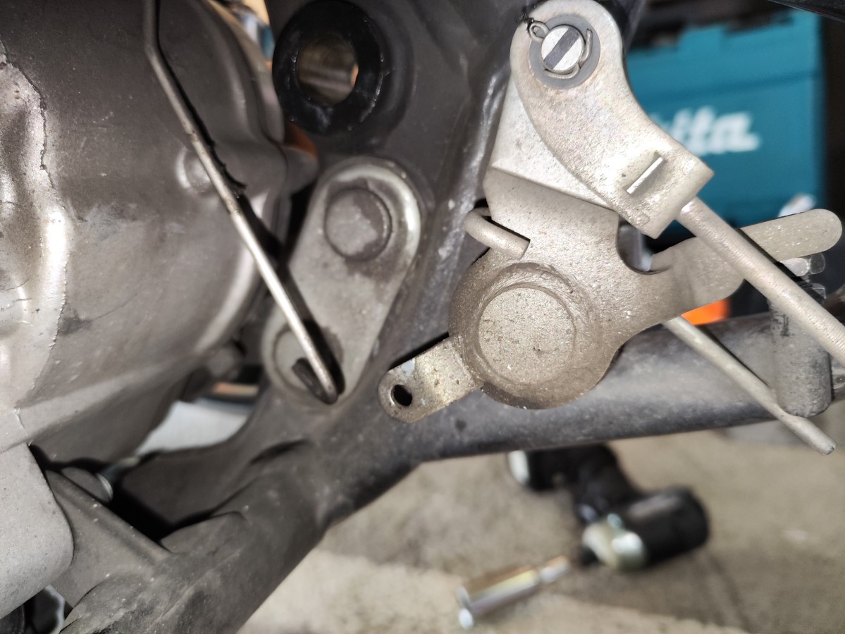 この作業は見た目以上にアクセスが難しく、リアホイールやスイングアームを取り外す必要があるため、分解の手間がかかります。その分、整備のついでにブレーキペダルのピボット部や、普段触れない部分を同時にメンテナンスしておくと安心です。
