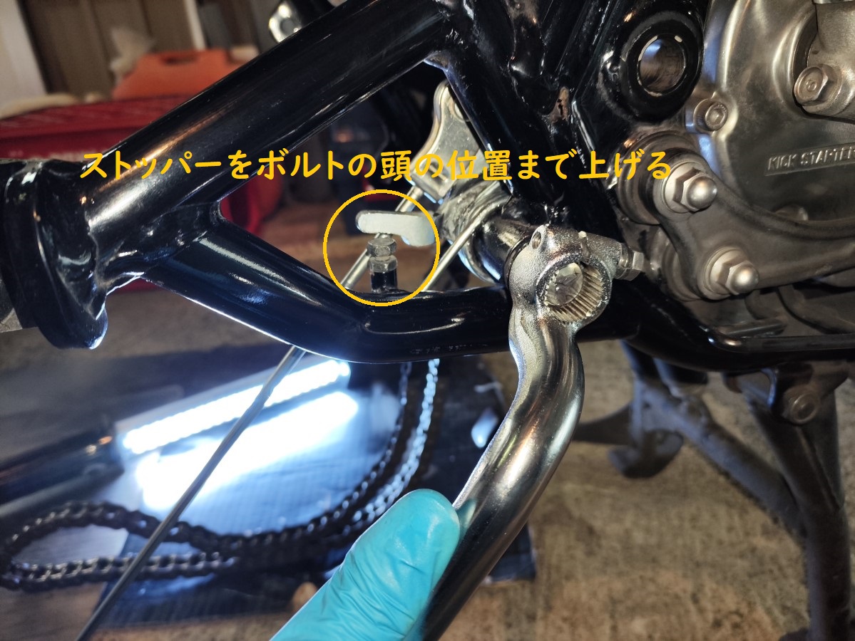 - ペダルを回して、ストッパーがアジャストボルトの頭を超える超える位置に調整します。