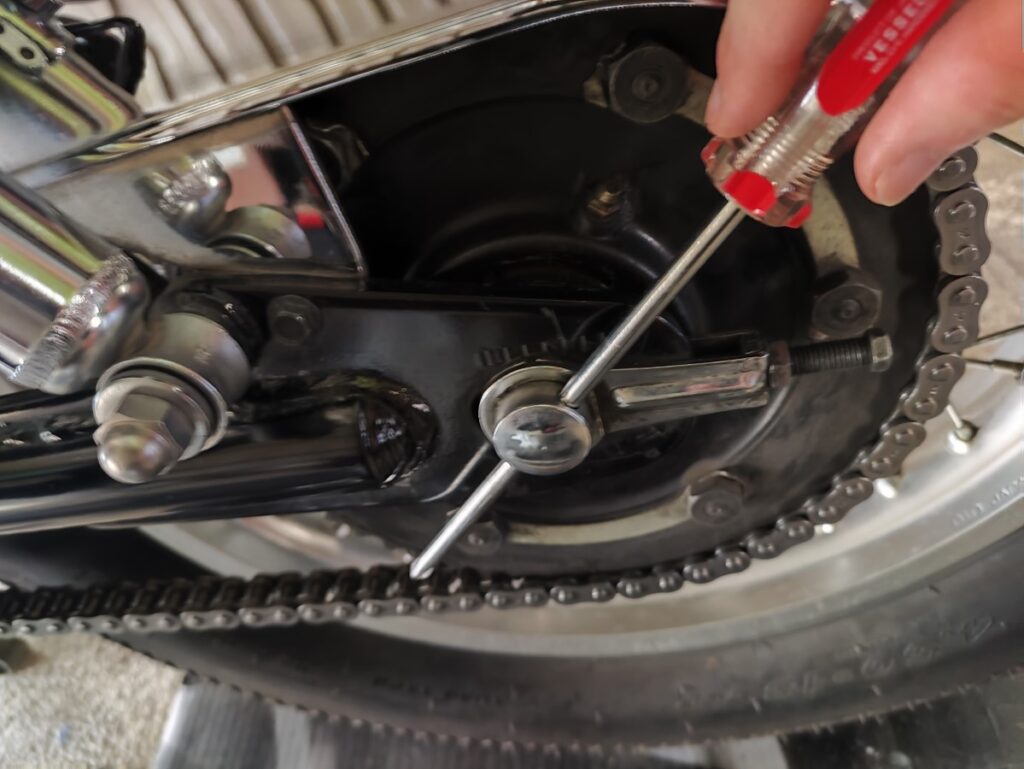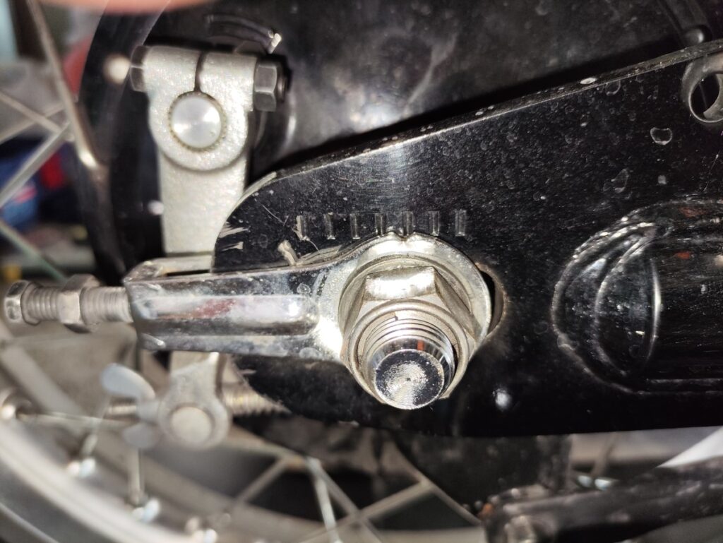 - チェーンのたわみ量を調整したら、反対側のアジャスティングボルトを均等に調整。(スイングアームのメモリを確認しながら)