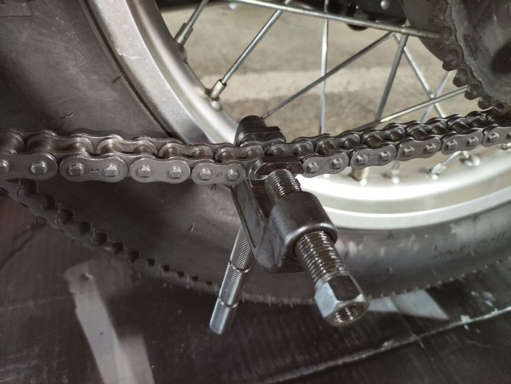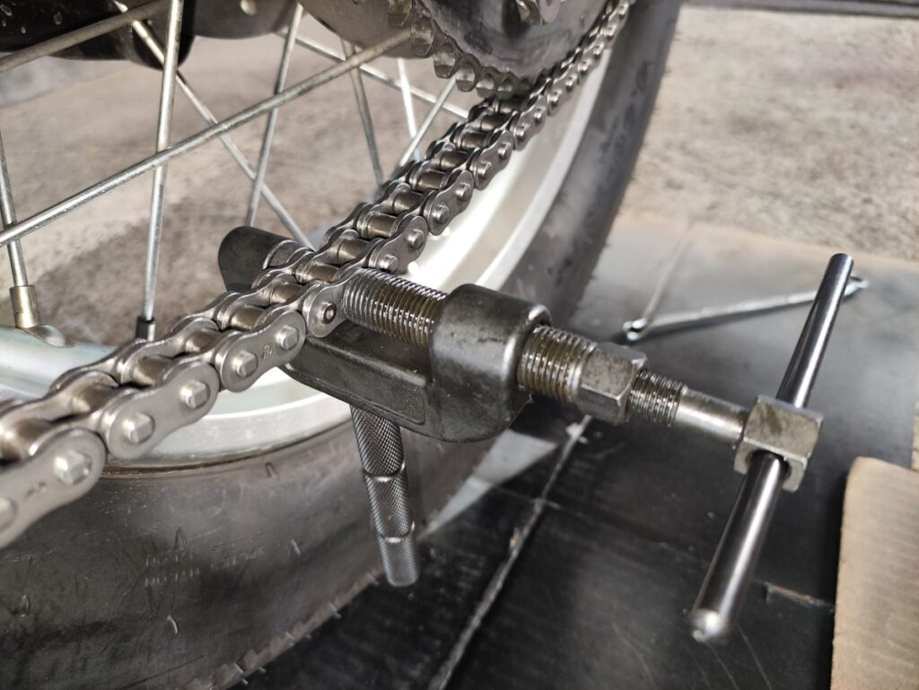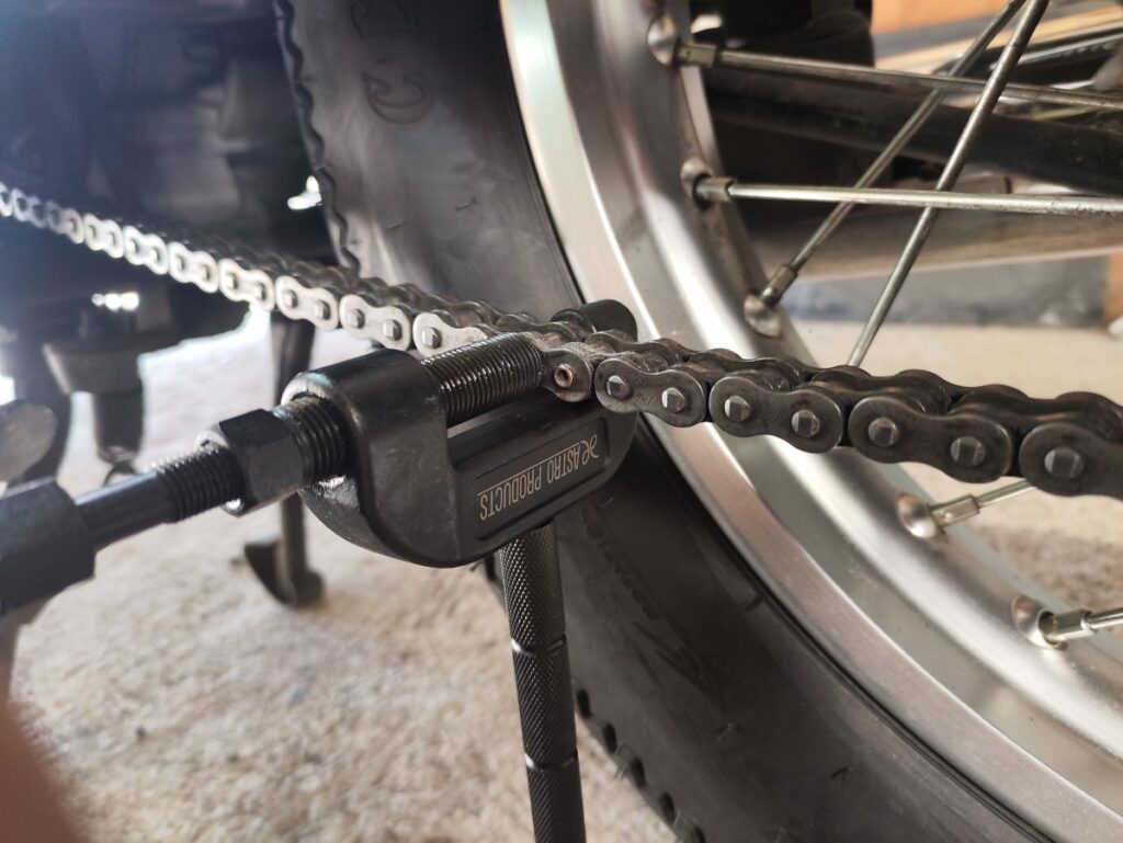 - その後、チェーンカッターを使ってピンを押し出し、チェーンを切断します。