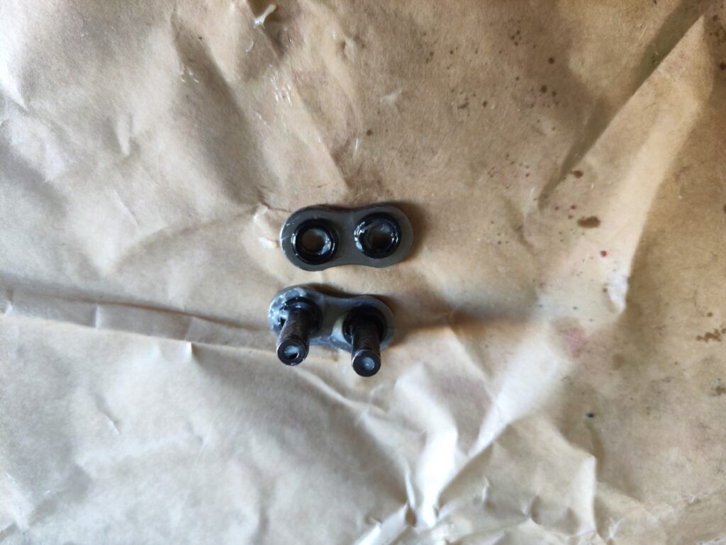 - ジョイント部分のピンの片側をヤスリやサンダーで、チェーンプレートの表面とピンの先端が面一になるくらいまで削る(柔らかい金属なので容易に削れます)