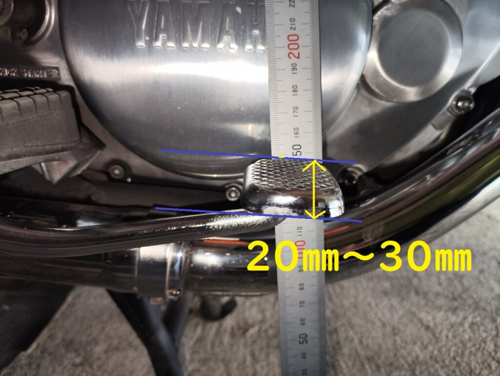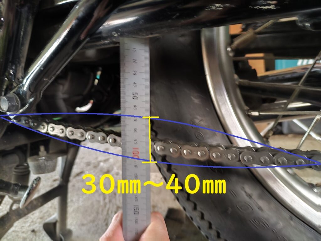 SR400のドライブチェーンのたわみ量は30~40mm が基準値です。この範囲内に収まるように調整することが大切です。