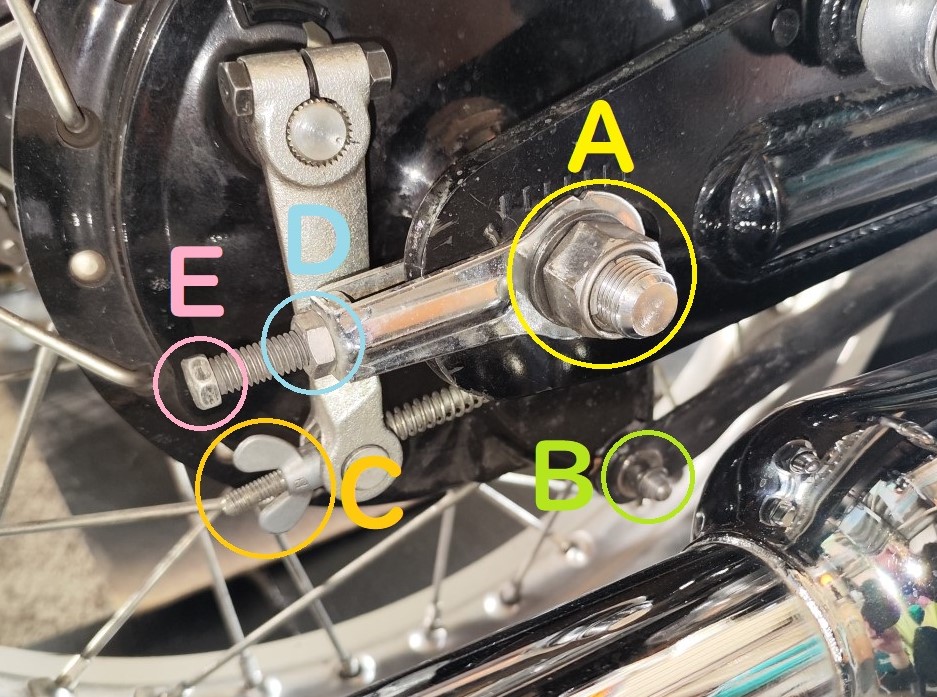 そしてチェーン調整用のE.アジャスティングボルトを緩め、チェーンの張りを緩くしておきます。