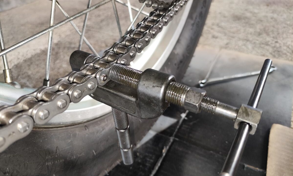 - その後、チェーンカッターを使ってピンを押し出し、チェーンを切断します。