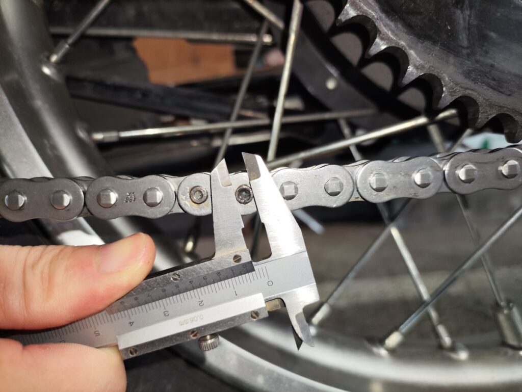 - 専用工具でピンをカシメ、ノギスで外径を確認する(DIDの428VXシリーズチェーンの場合カシメサイズは5.2㎜以上です。)