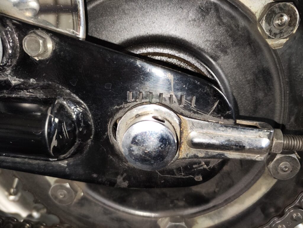 - チェーンのたわみ量を調整したら、反対側のアジャスティングボルトを均等に調整。(スイングアームのメモリを確認しながら)