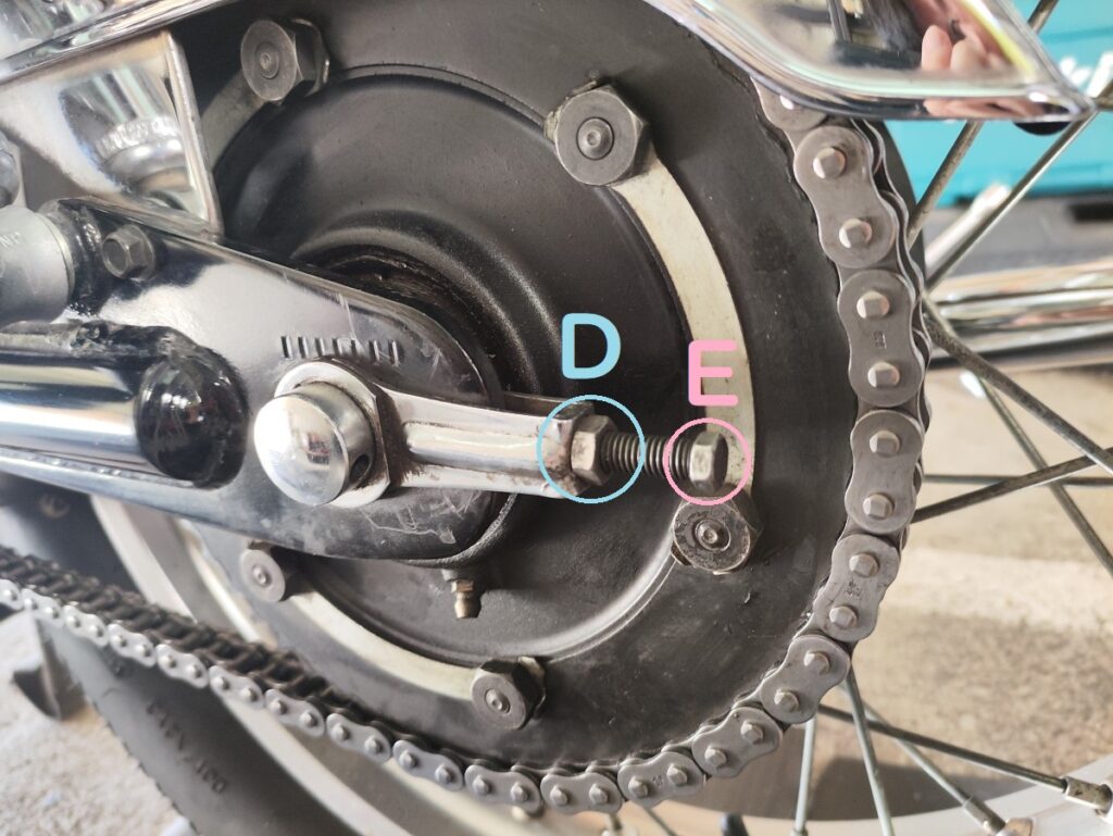 - チェーン側のE.アジャスティングボルトを回し、たわみ量を基準値(30㎜~40㎜)に調整。