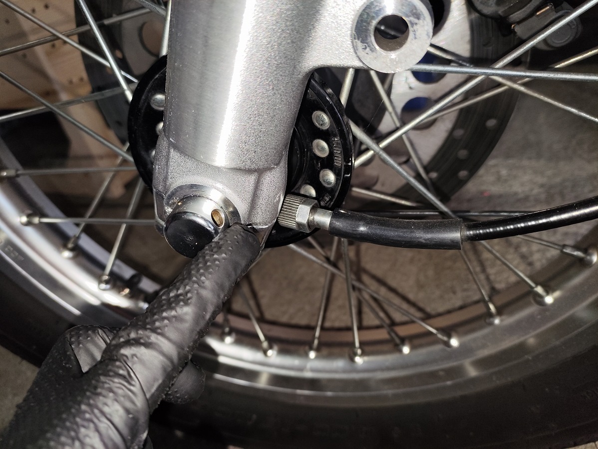 ①ホイール側のスピードメーターケーブルを取り外す