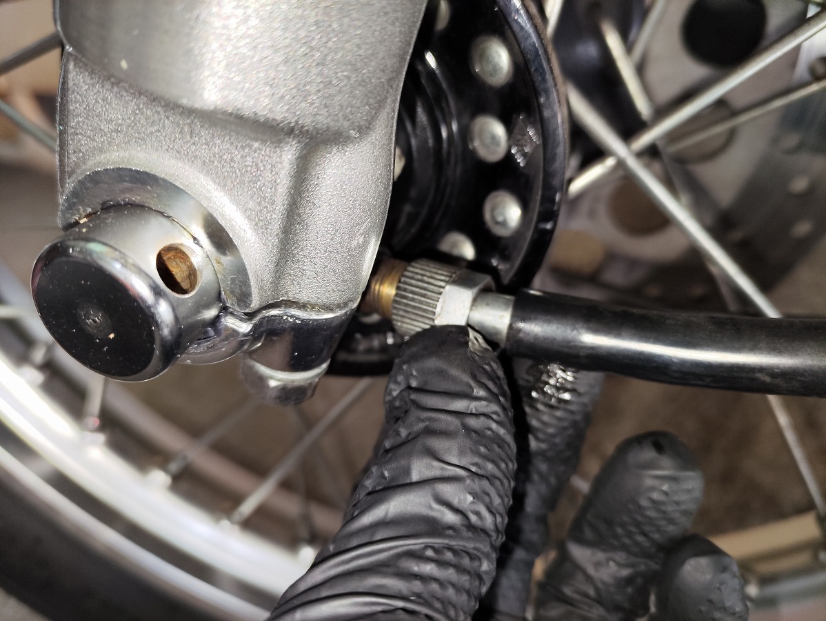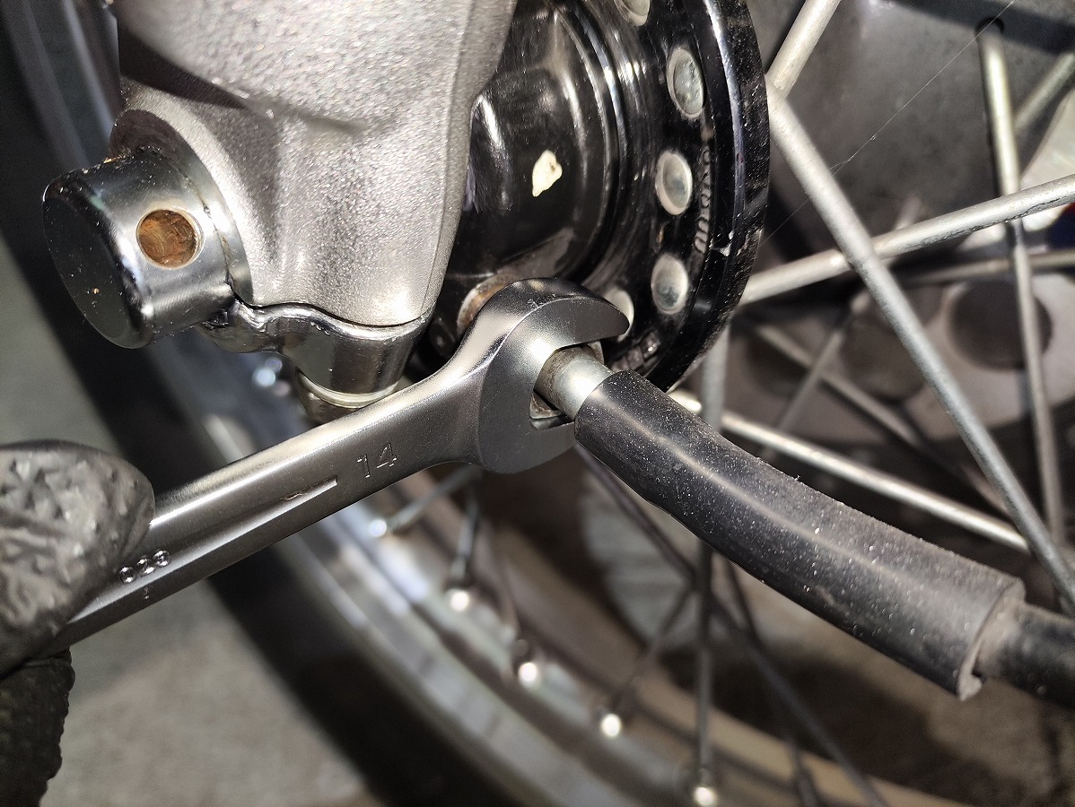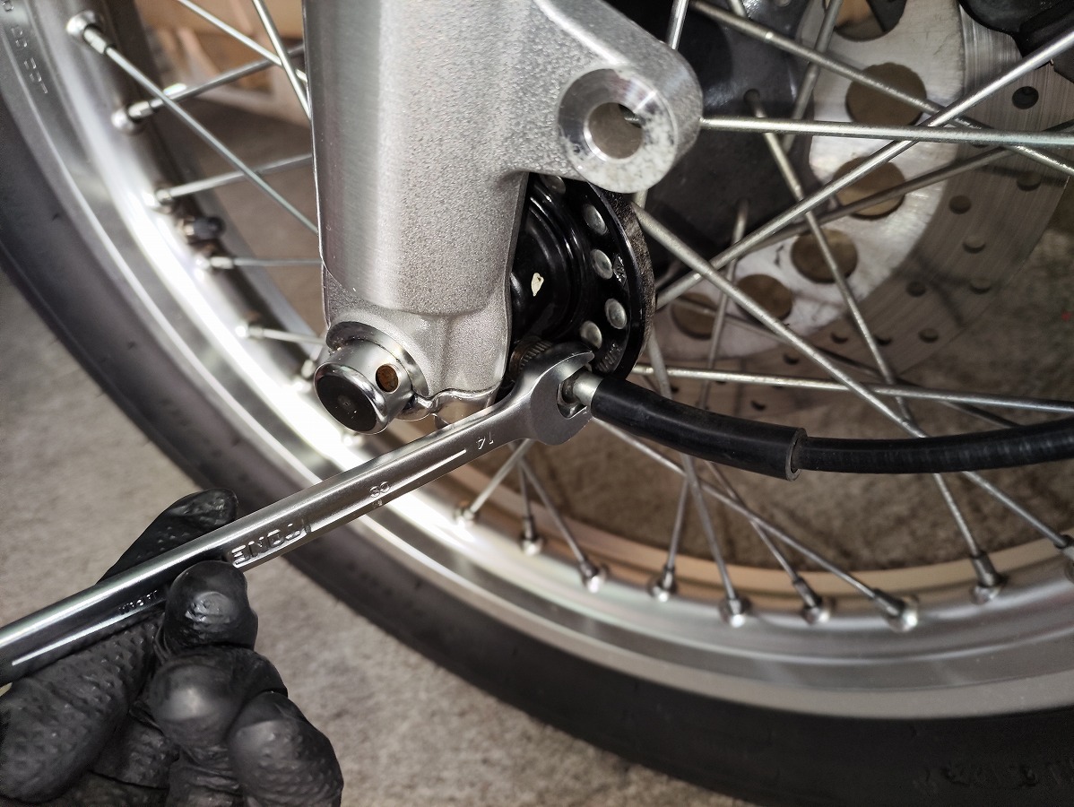 - フロントホイール左側のギアユニットに接続されている、スピードメーターケーブルをオープンスパナ14mmを使用して取り外す