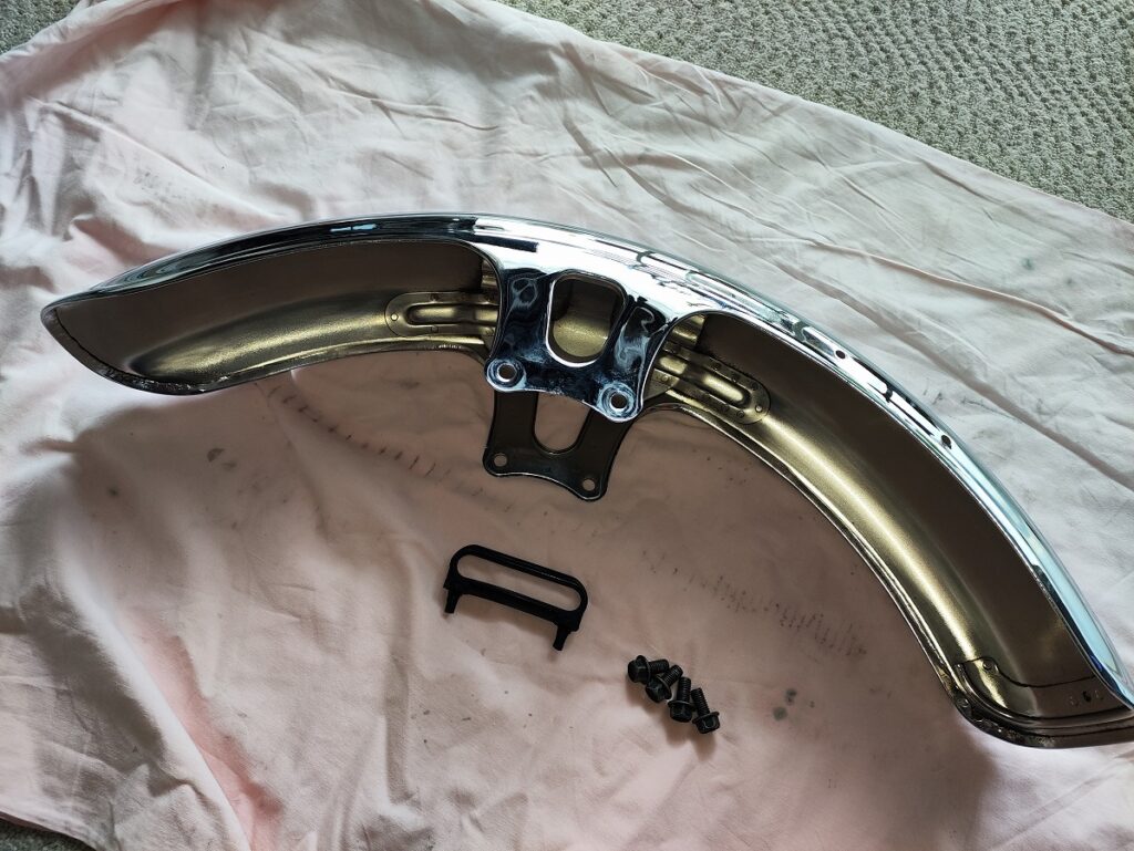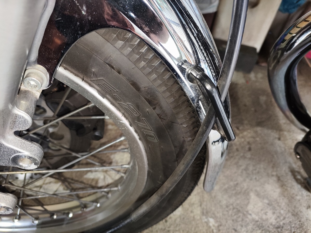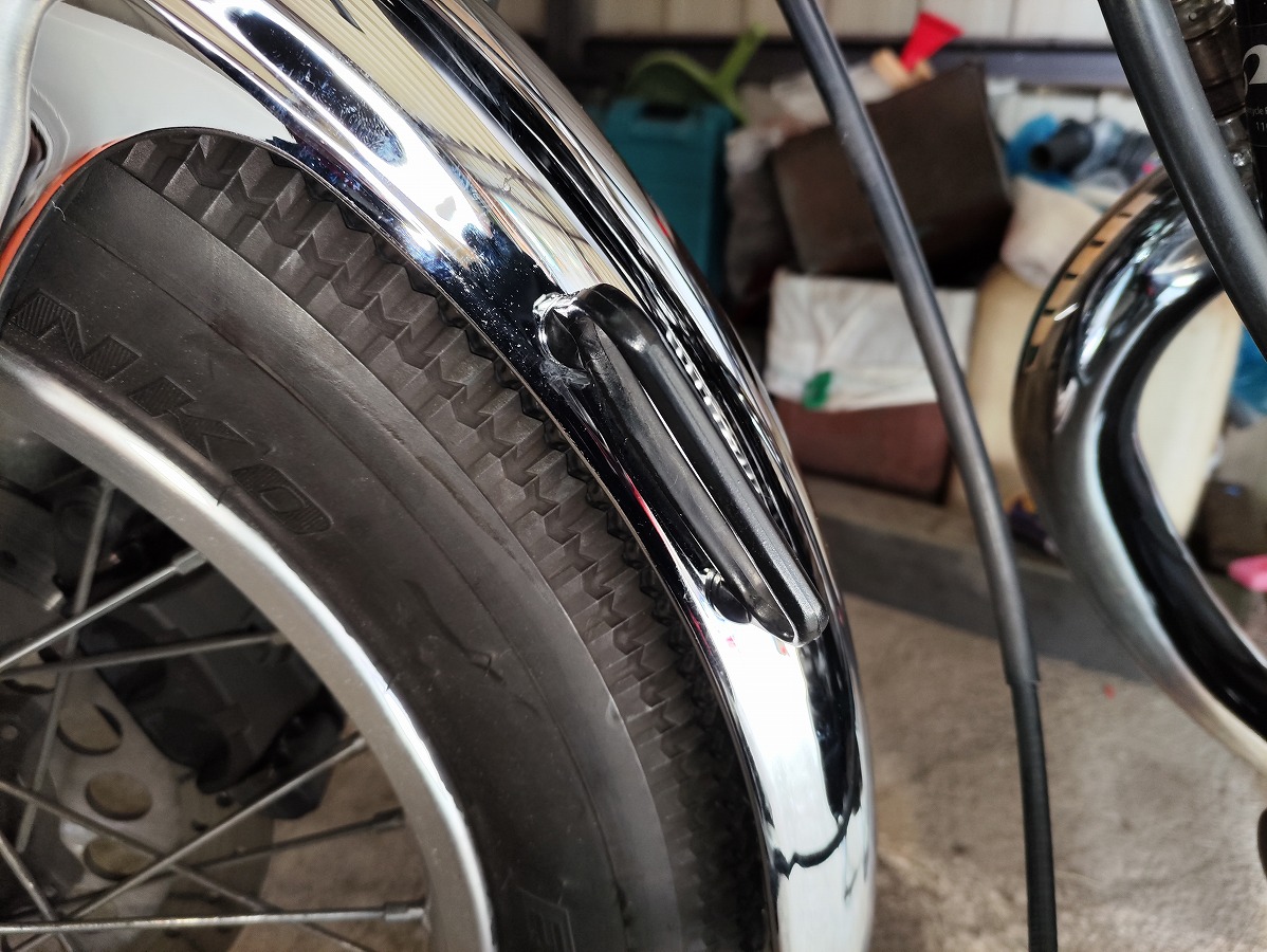 SR400のフロントフェンダーはスチール製で、タイヤとの隙間が狭く清掃しにくいため、内部に汚れが溜まりやすく錆が進行しやすいパーツです。