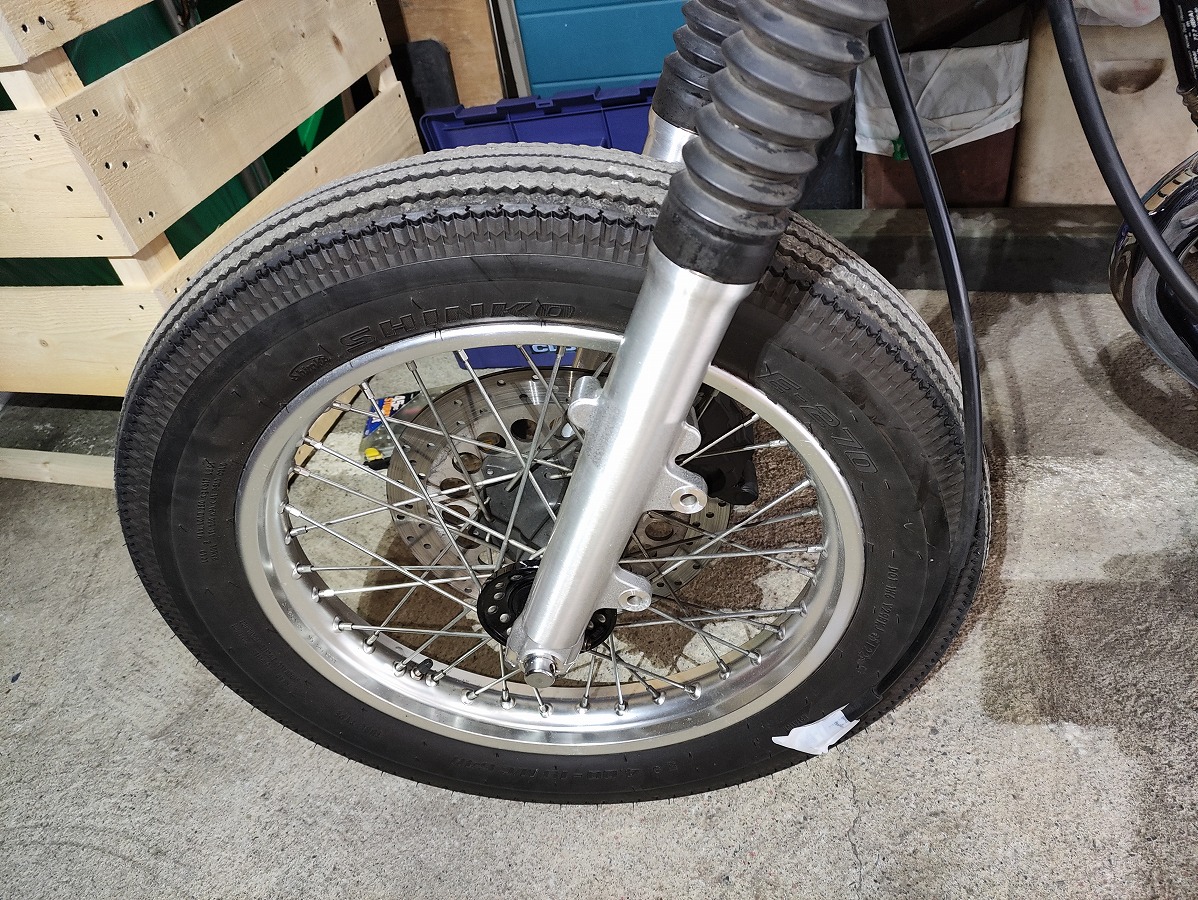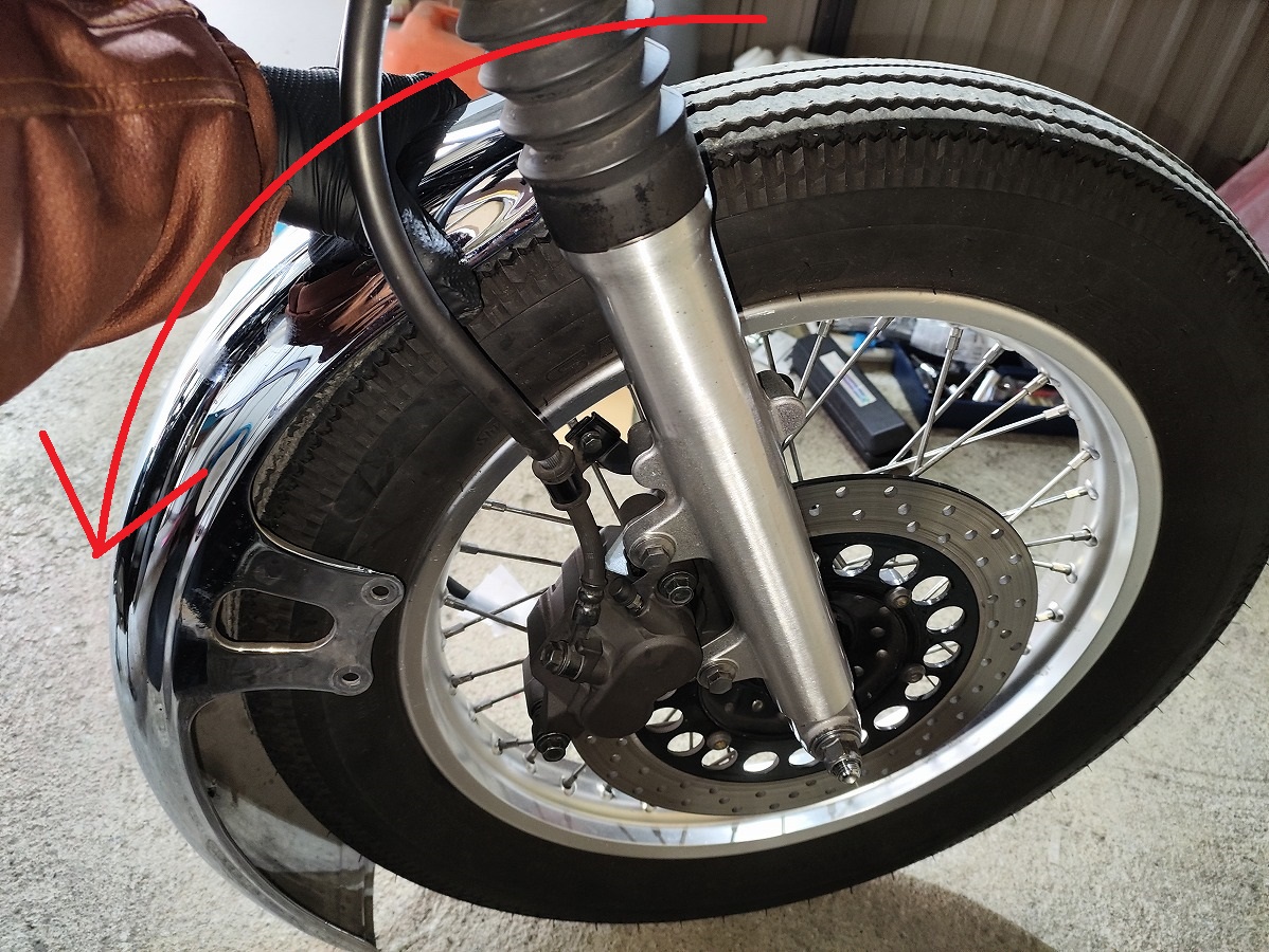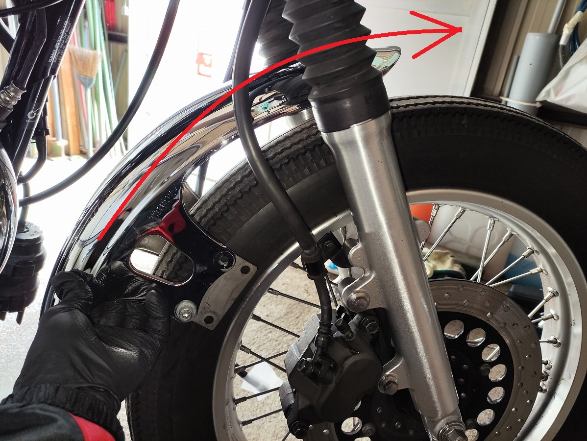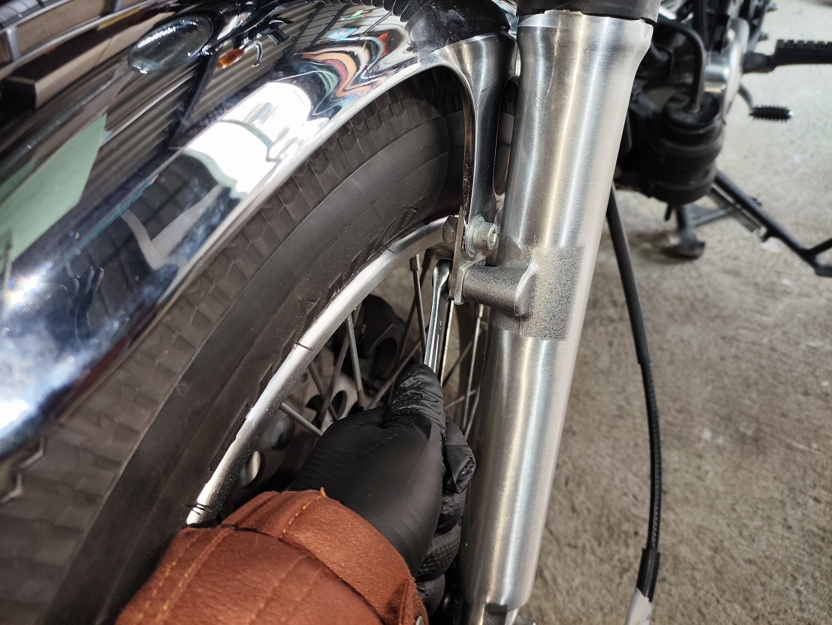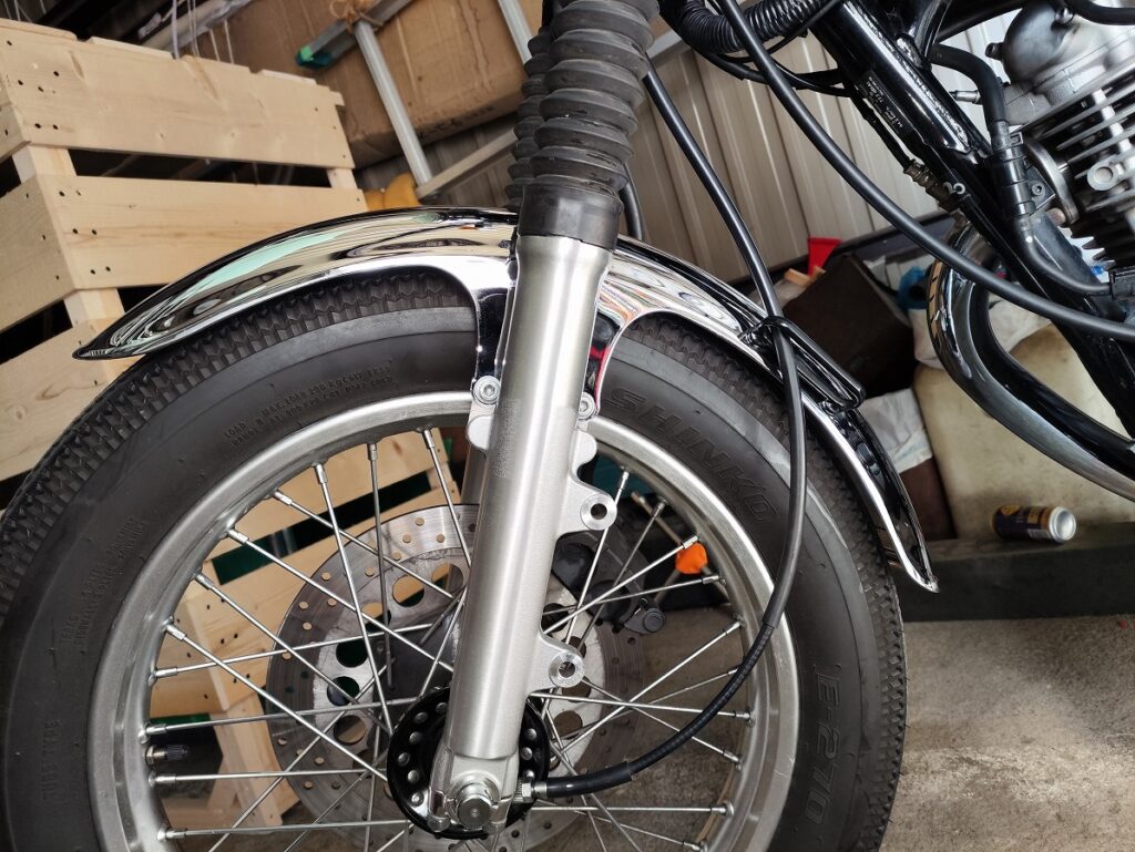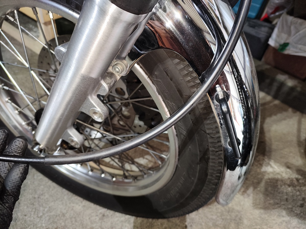 SR400のフロントフェンダーは フロントホイールを取り外さなくても脱着できる構造 になっているため、初心者でも比較的作業しやすい整備です。