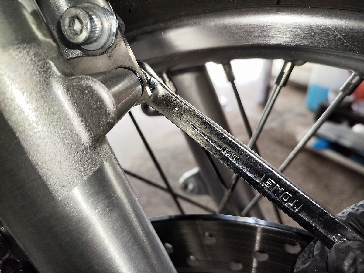 トルク管理を確実に行いたい場合は、先にフロントホイールを取り外して作業してください。