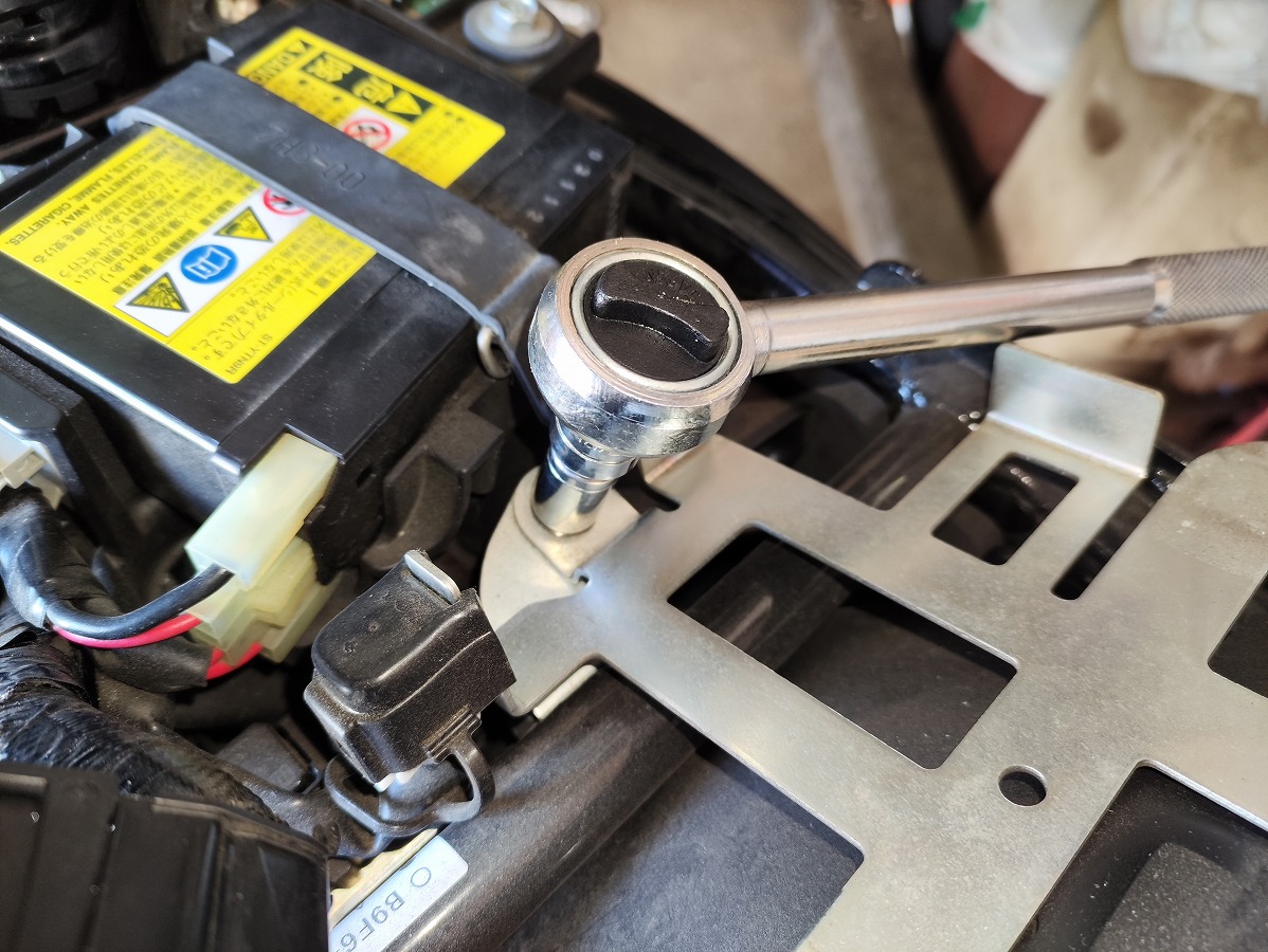 - ナンバープレートを取付ボルトとナット(10mm)2本で取り付ける