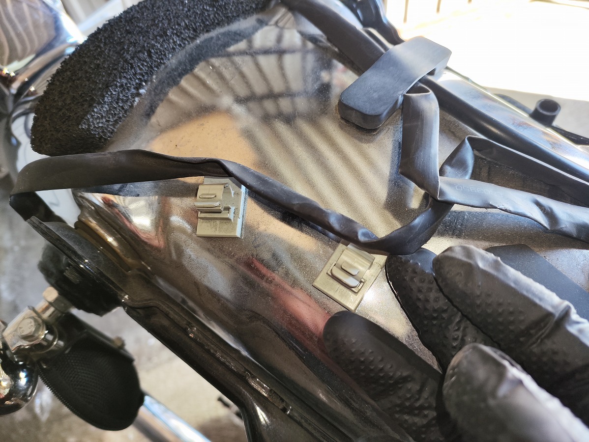 - リアフェンダーとマッドガードに両面テープで貼られている、ゴムのシートを外す。