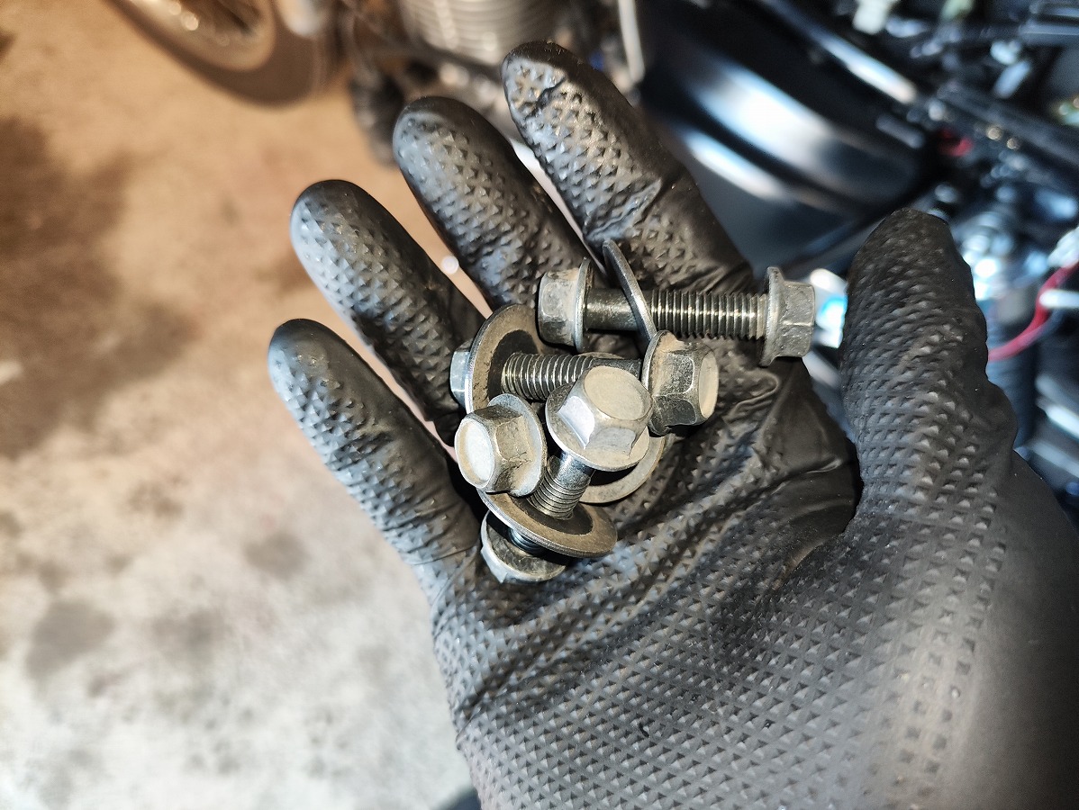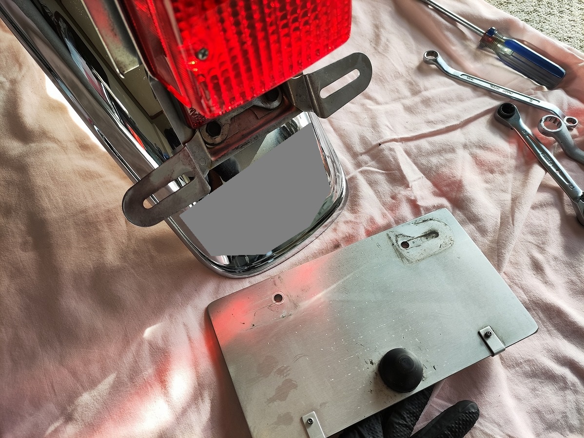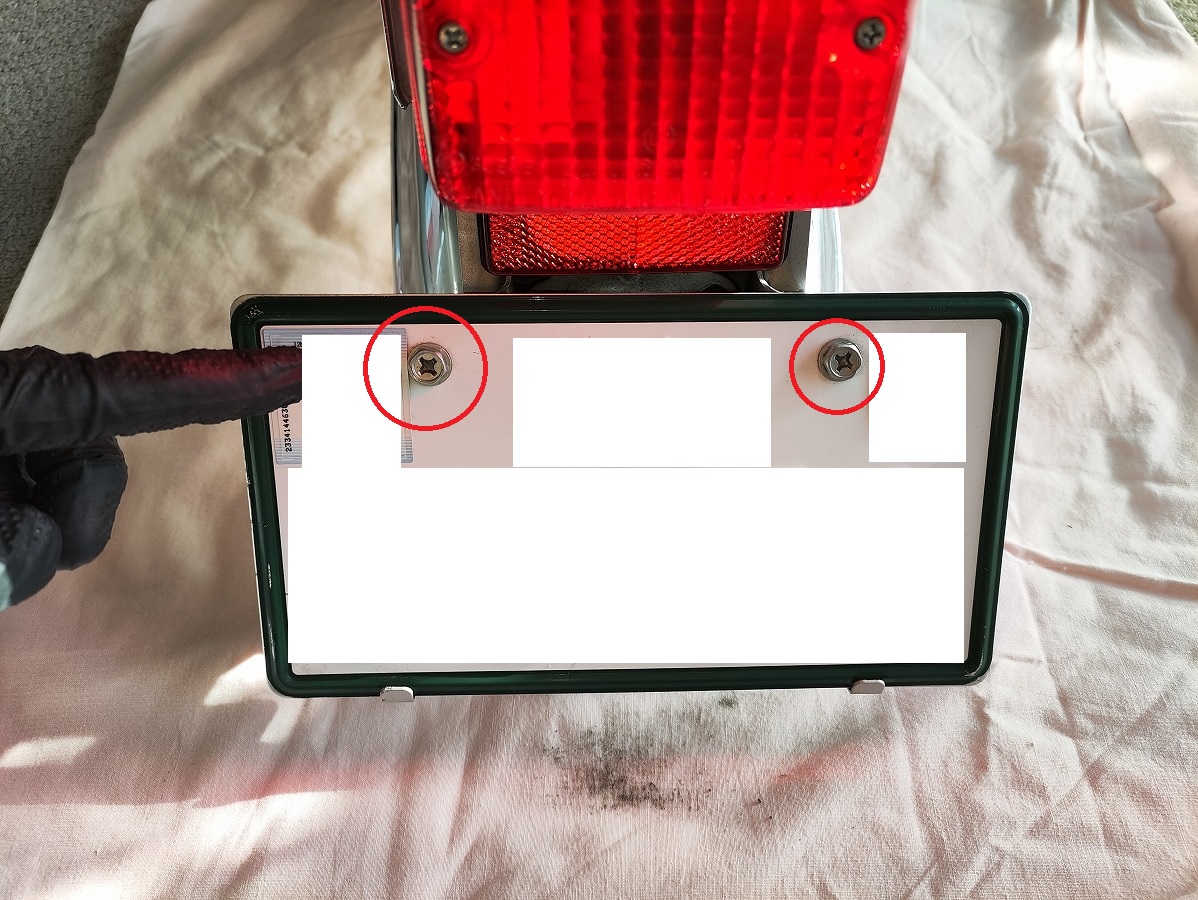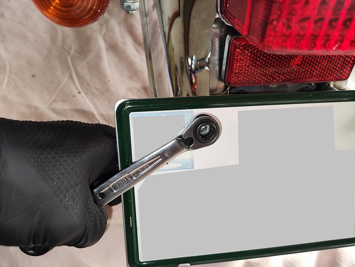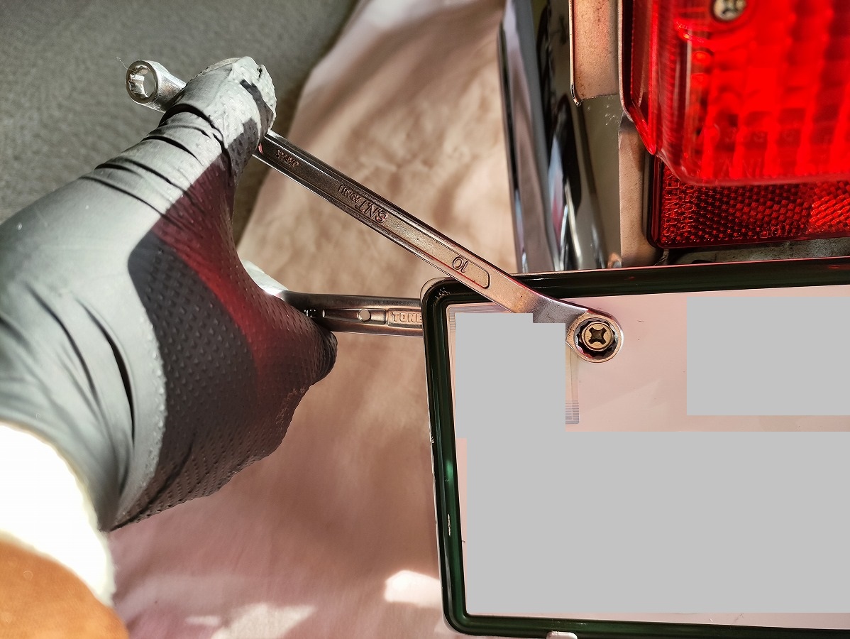 - ナンバープレートの固定ボルトとナット(10mm)を取り外し、ナンバープレートを外す