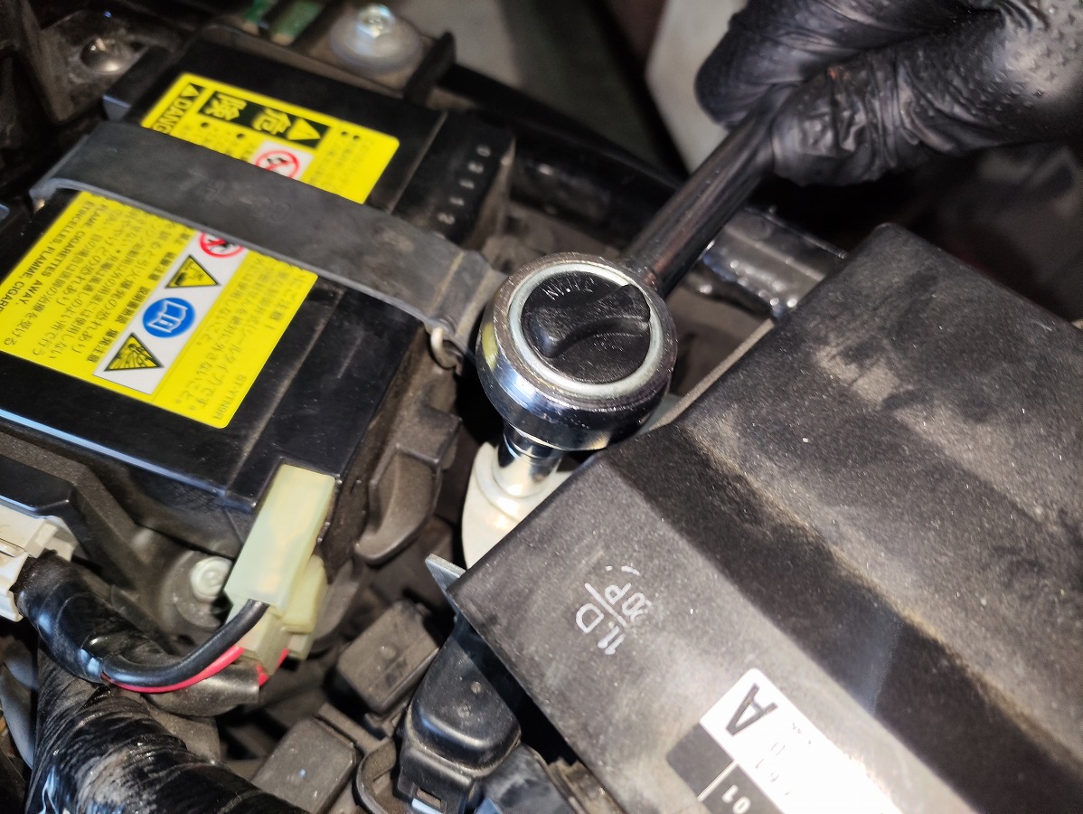 前側1本は奥まっているため、ソケット+ラチェットを使用。ボルトを落下させないよう注意