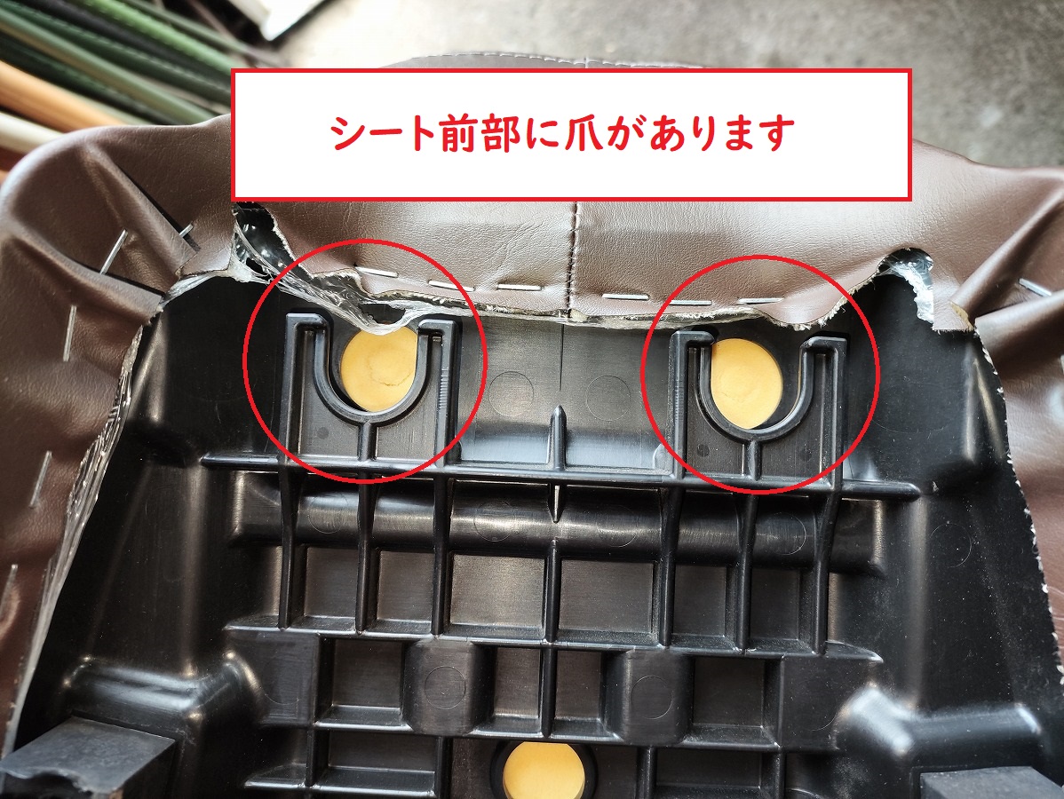 - 爪が外れたら、シート前部分を上に持ち上げ、グラブバーに当たらないよう注意しながら取り外します。