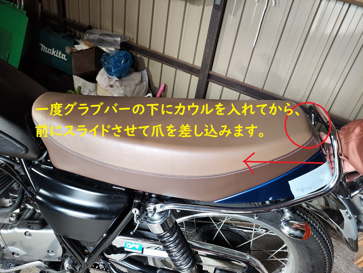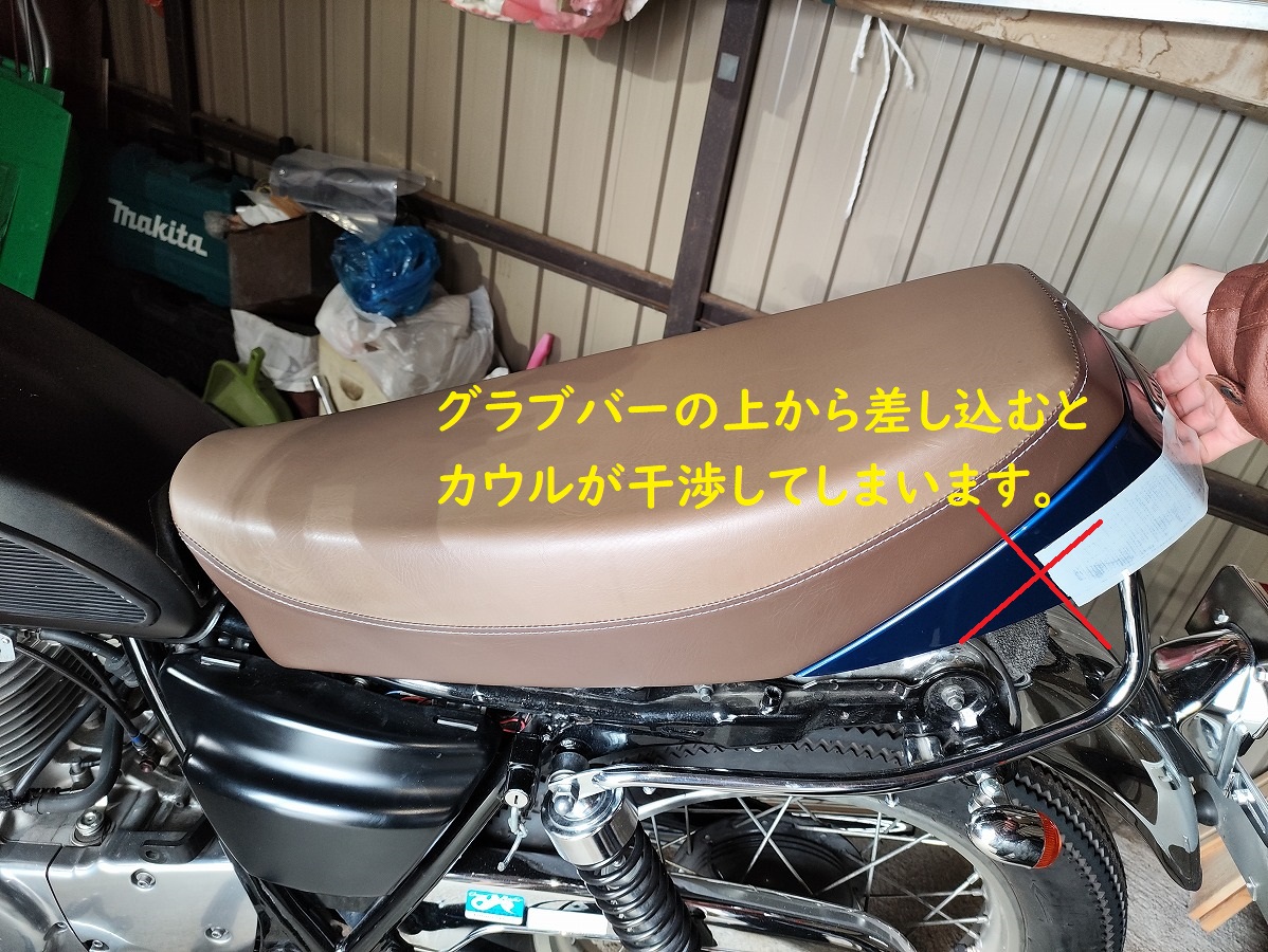 - シートを外す際、シートカウルとグラブバーが干渉しやすいので、養生テープなどでカウル周りを保護しておくと安心です。