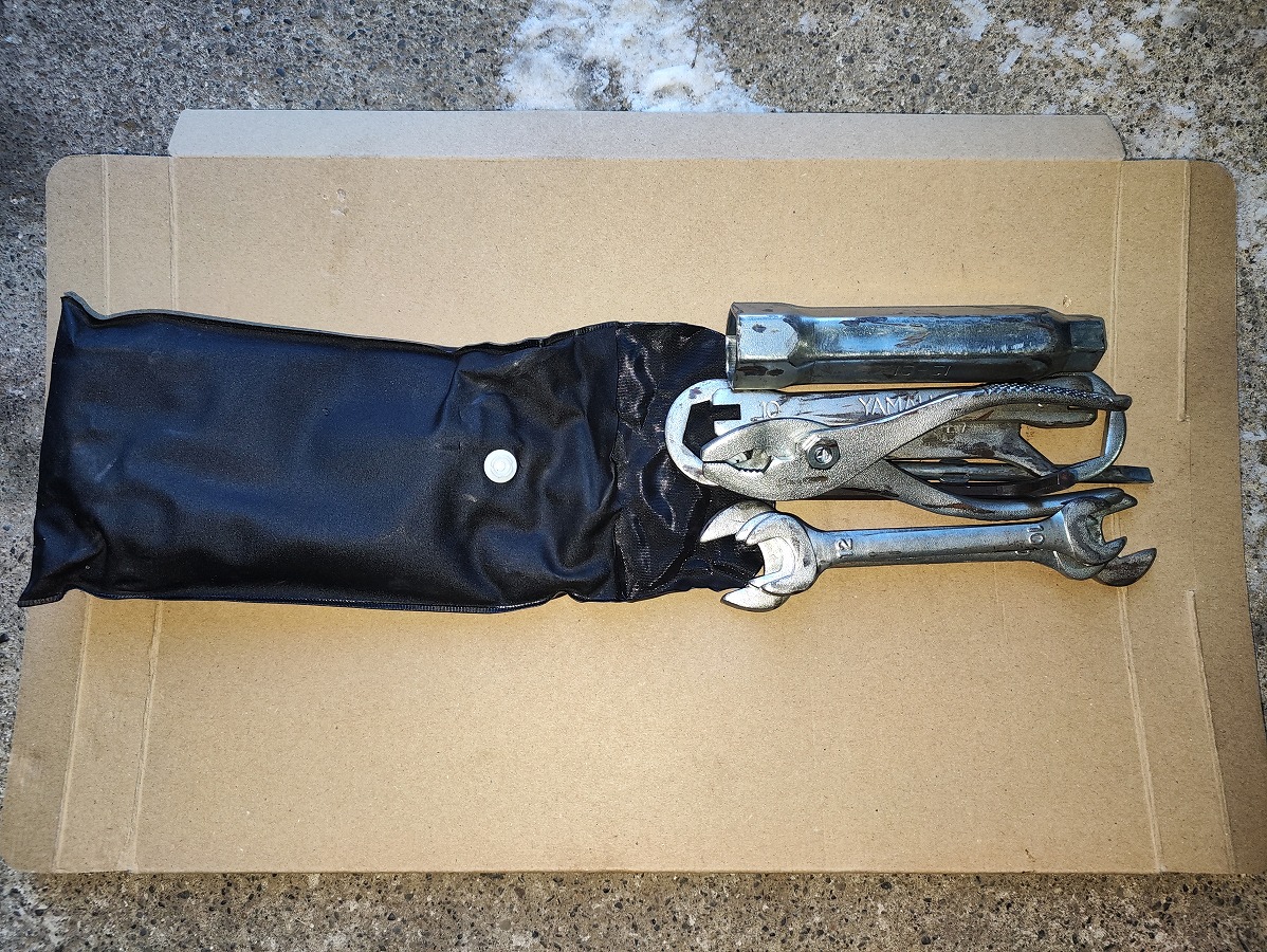 - 黒いナイロン製の工具袋が入っています。中には基本的な整備工具が入っています。