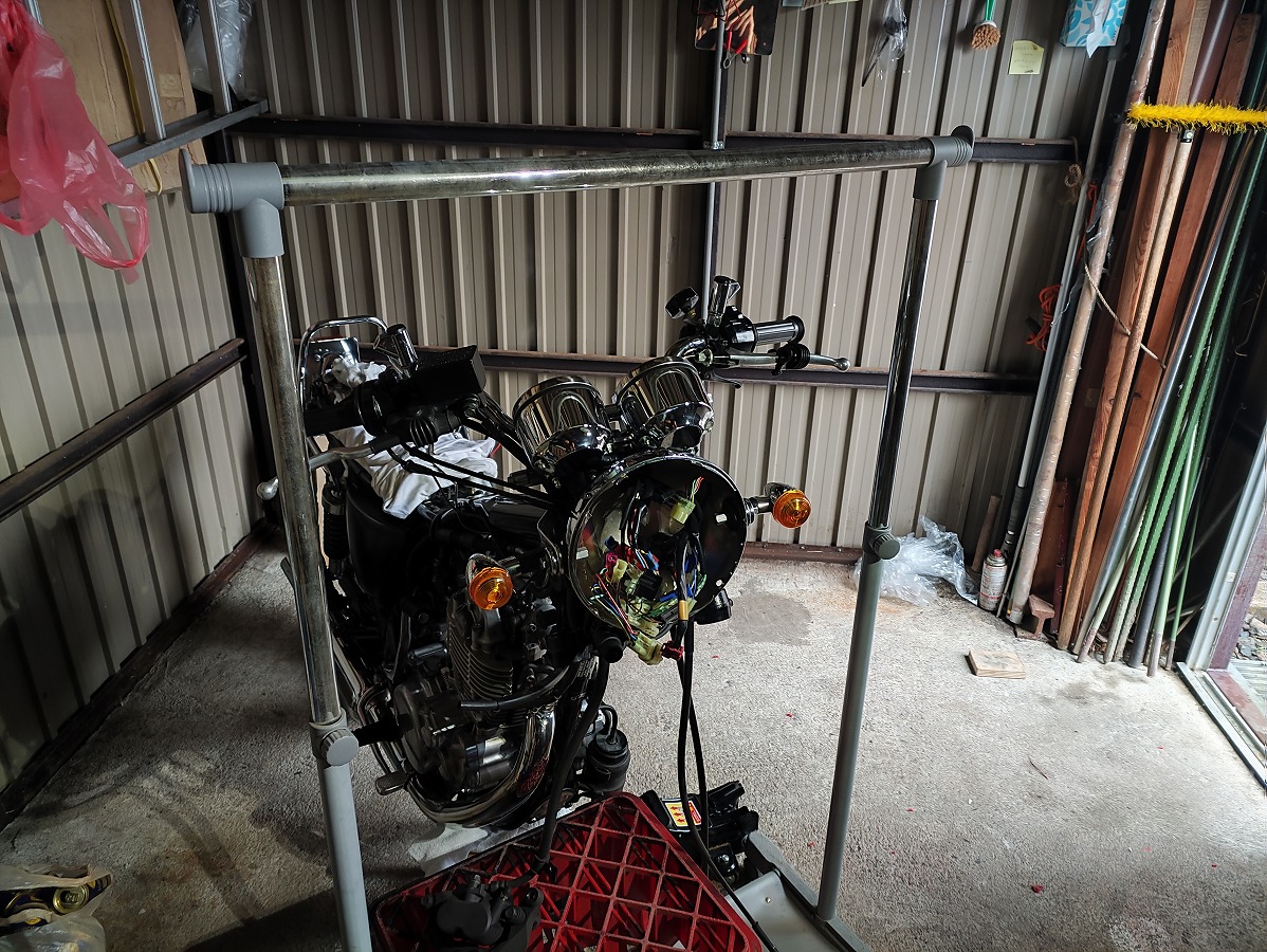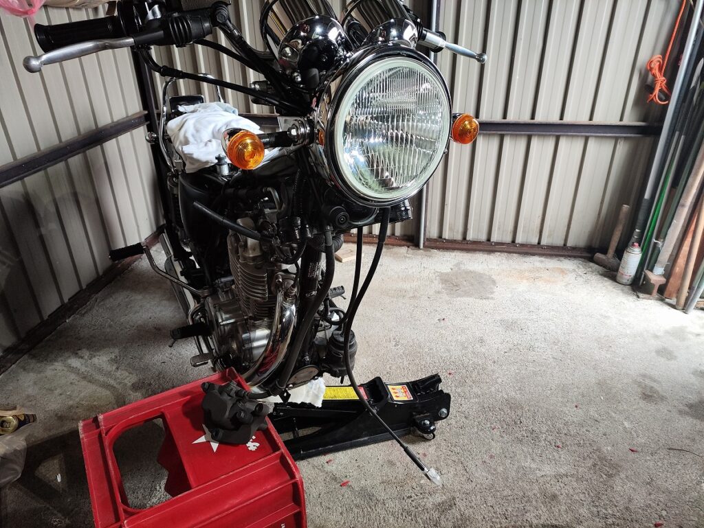 - SR400を平坦で安定した場所に設置し、センタースタンドを立てる