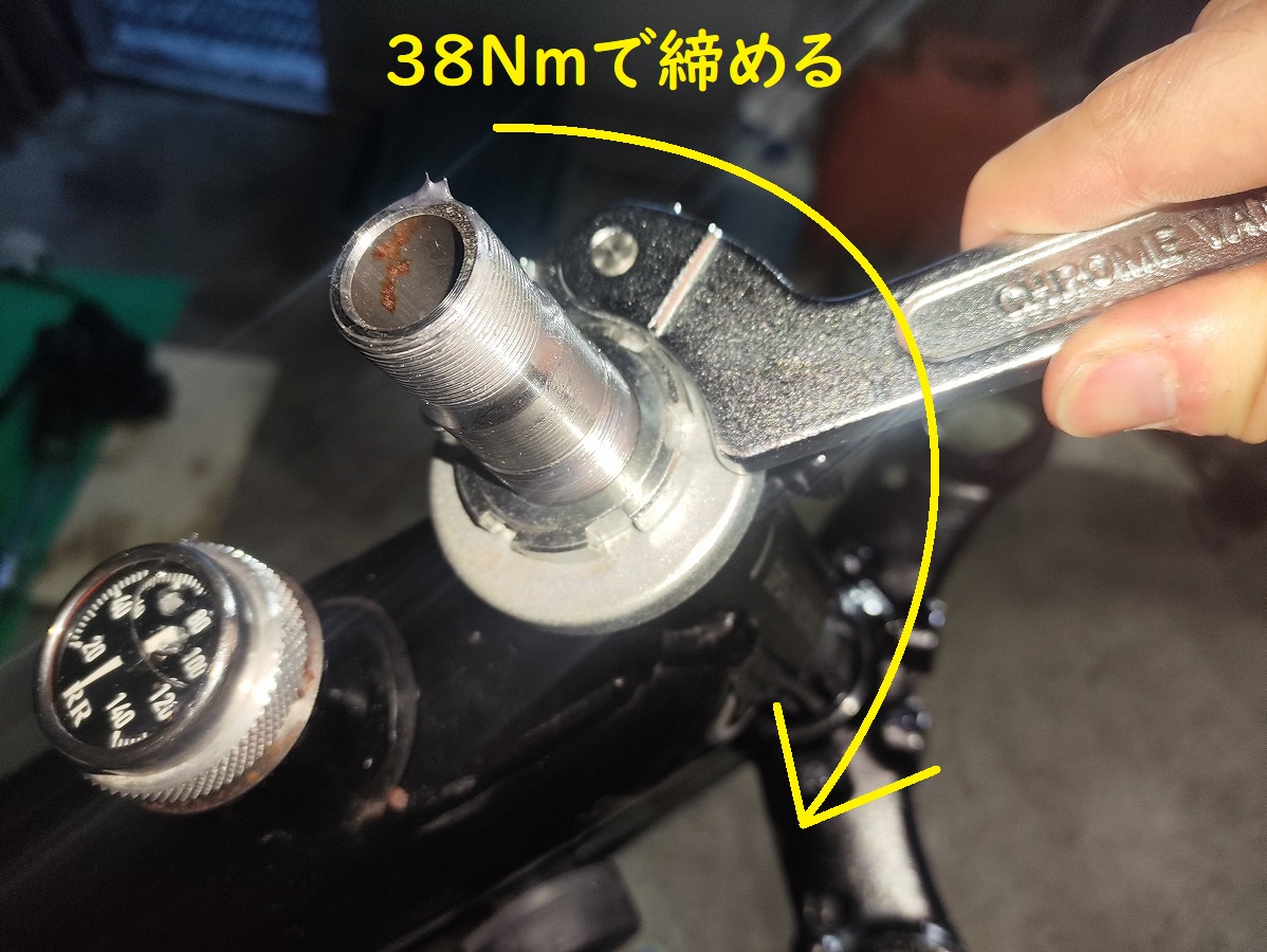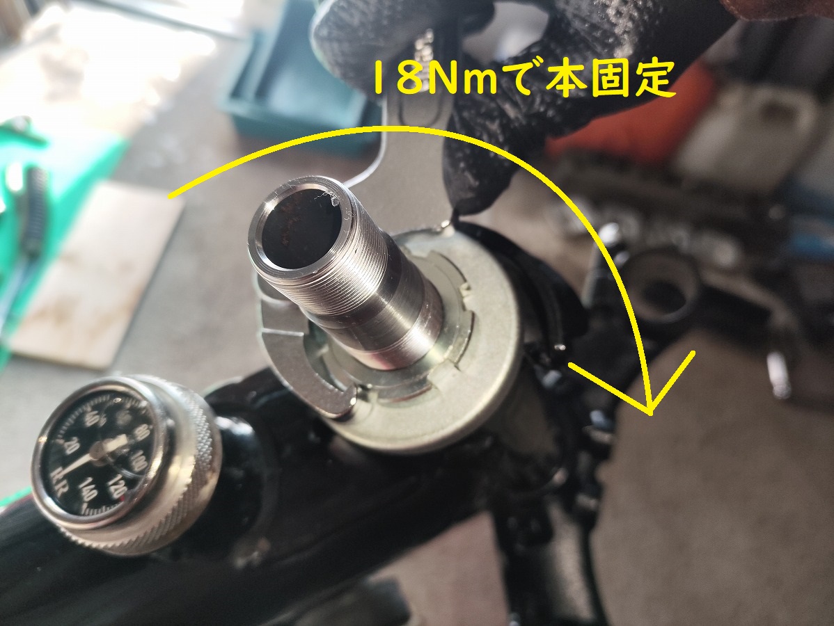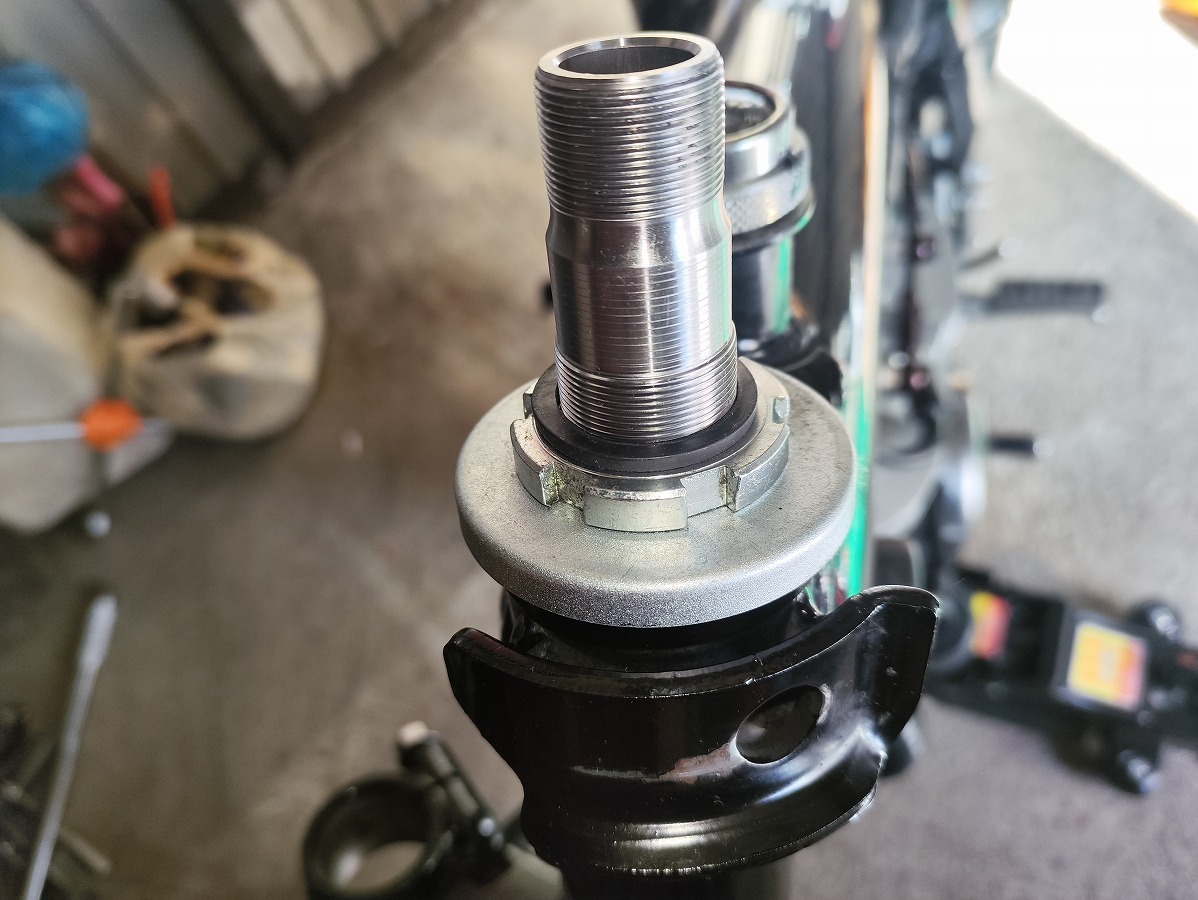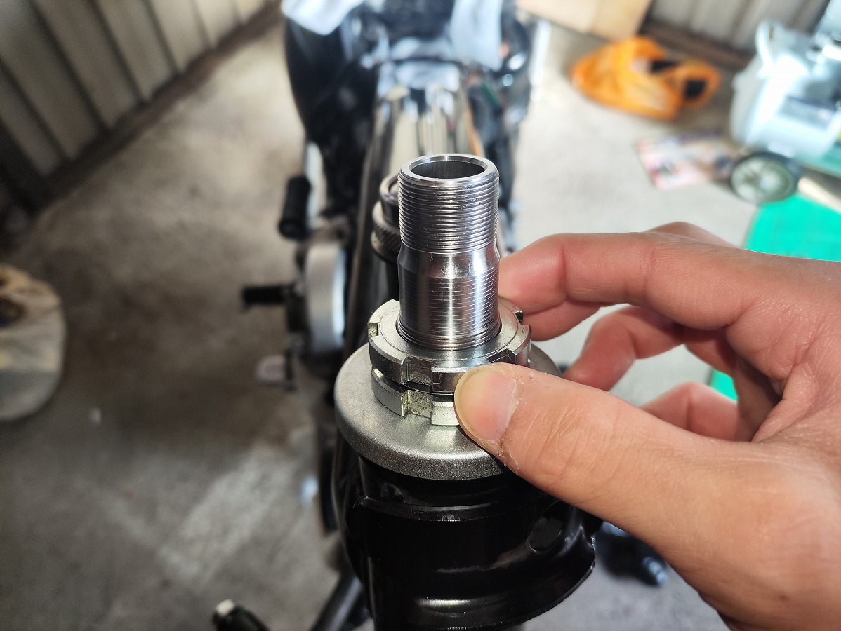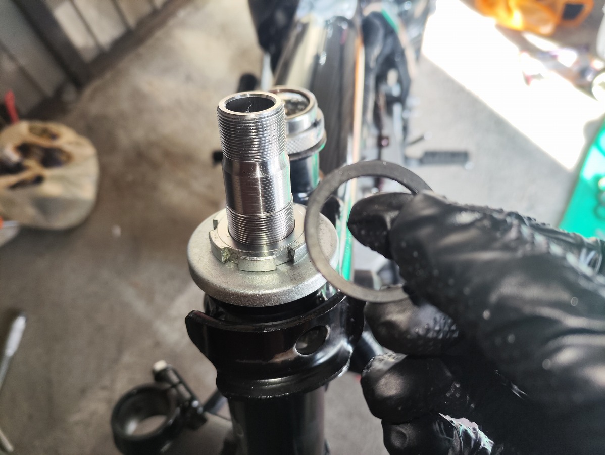 - ワッシャーを忘れずにセットし、ステムのキャップナット(27mm)を締め付け