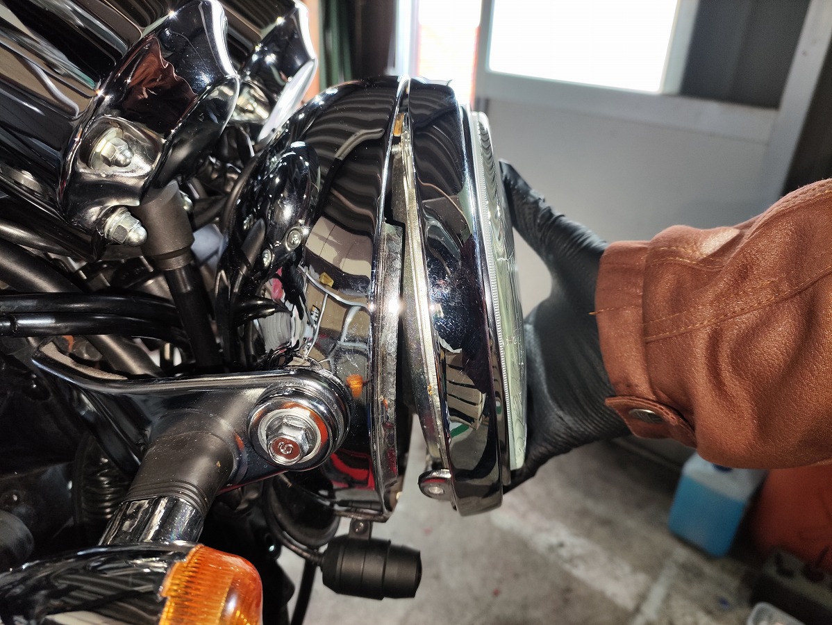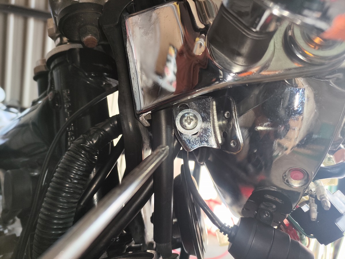 フロント回りの動きに余裕があるこのタイミングで、ヘッドライトボディを取り付けると作業しやすい(ハーネス類の取り回しが楽になるため)