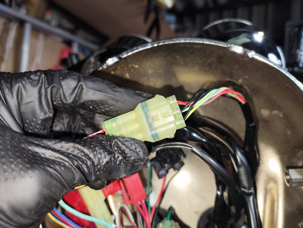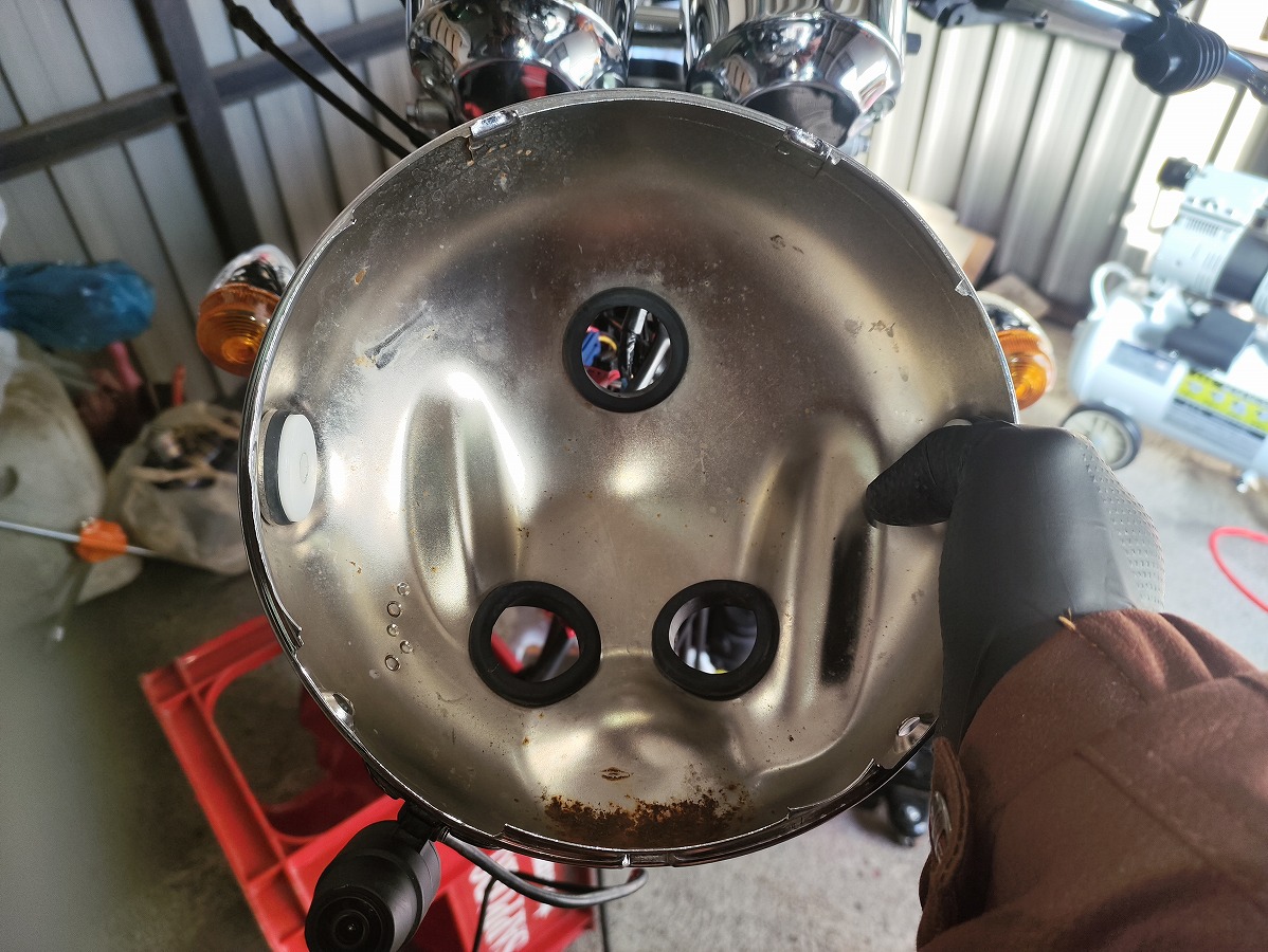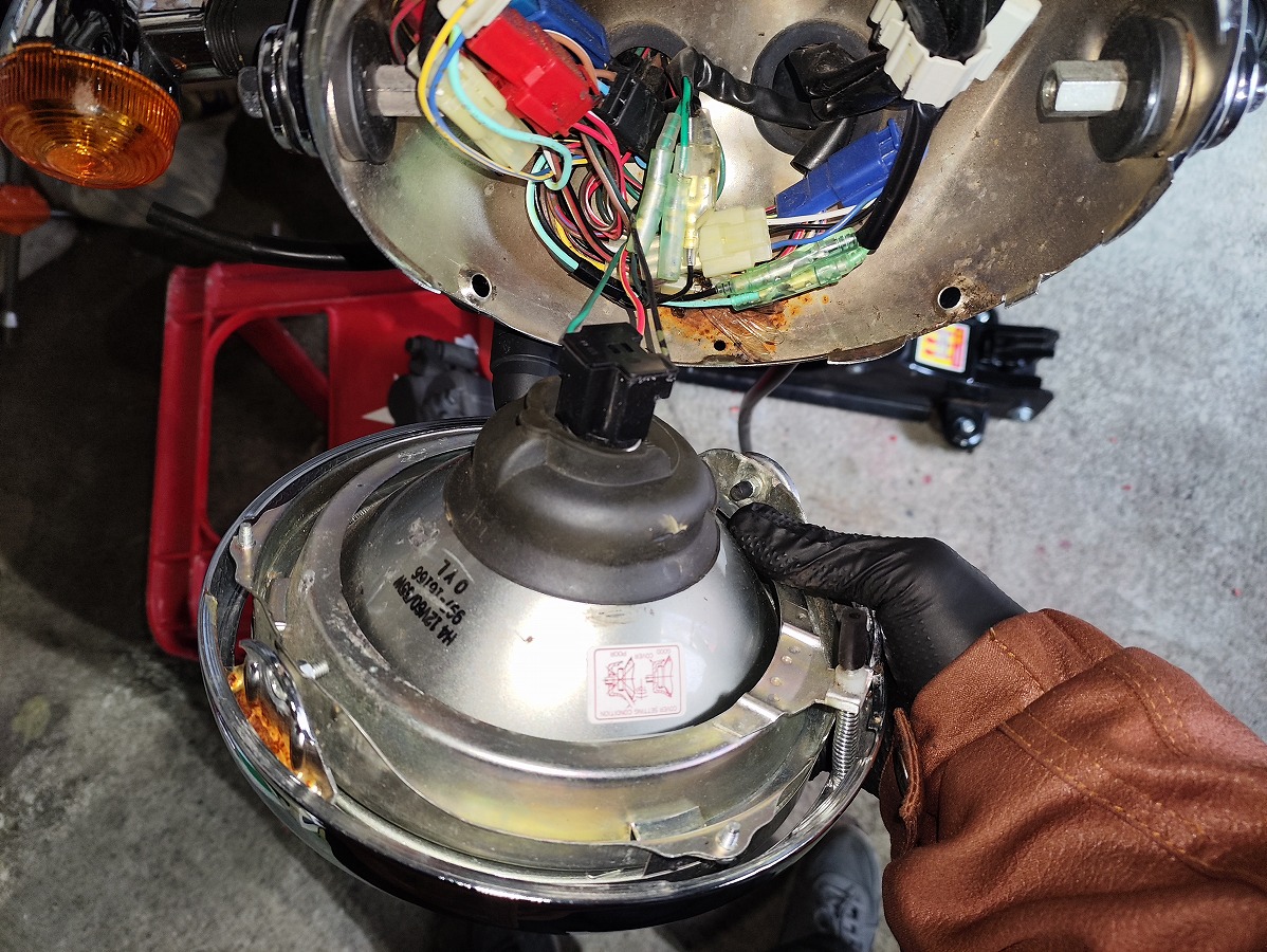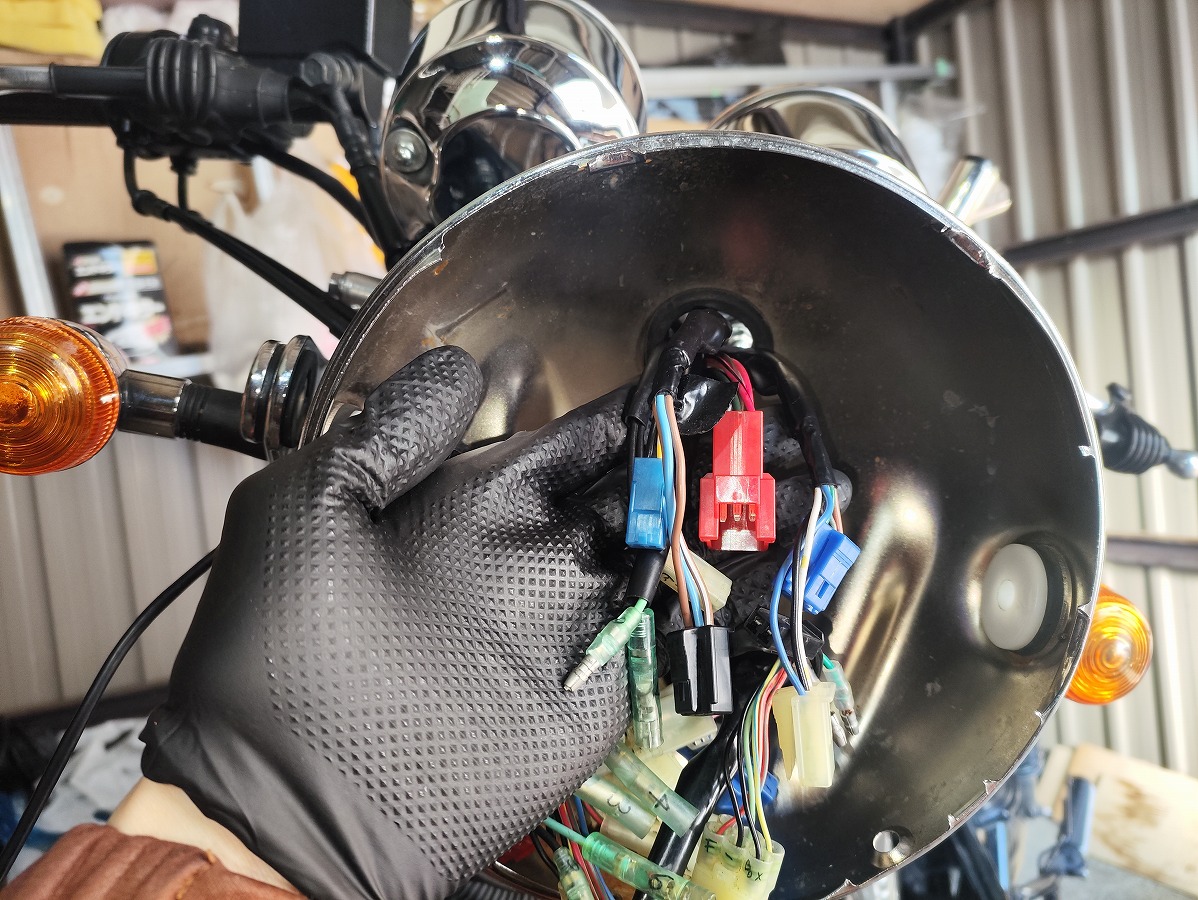 - 3つの穴からハーネスをすべて引き出し、ヘッドライトボディを取り外す