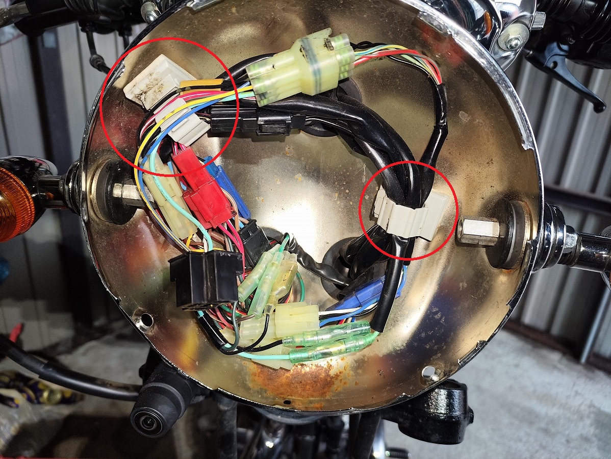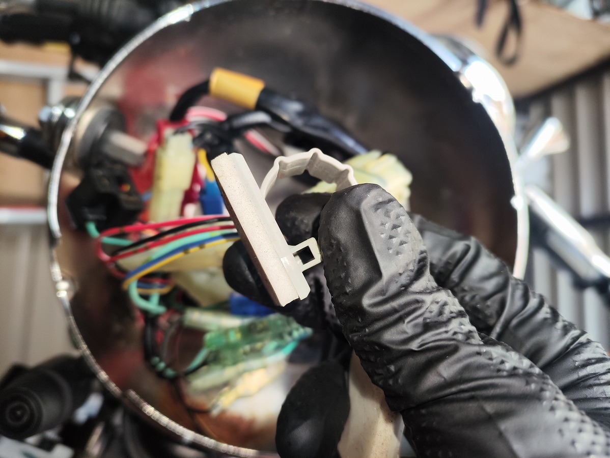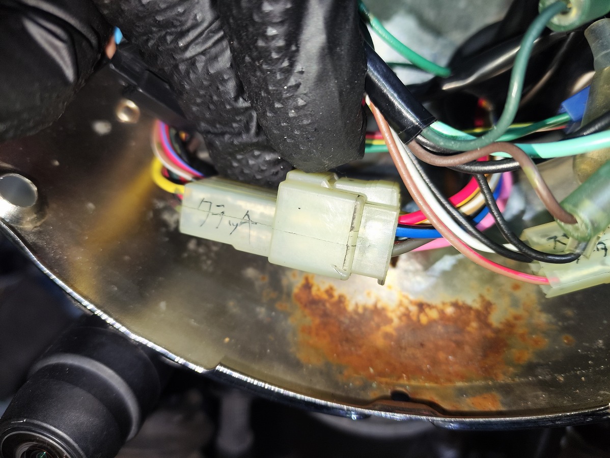 - ヘッドライトボディ内のでハーネスをまとめているクランプ2個を取り外す