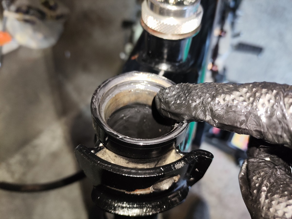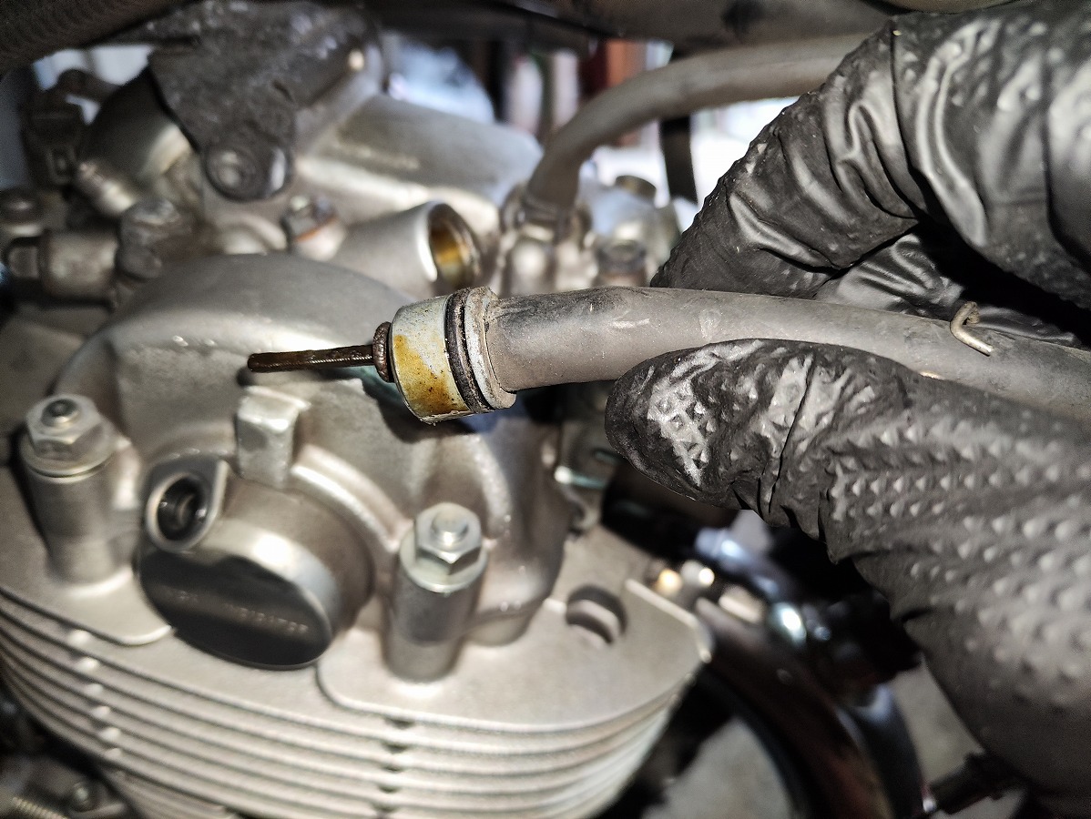 SR400はドライサンプ方式を採用しており、フレーム自体がオイルタンクとして機能する少し特殊な構造を持っています。その影響で エンジンオイルの熱がステム周辺に伝わりやすく、ベアリング内部のグリスが流れやすい 傾向があります。