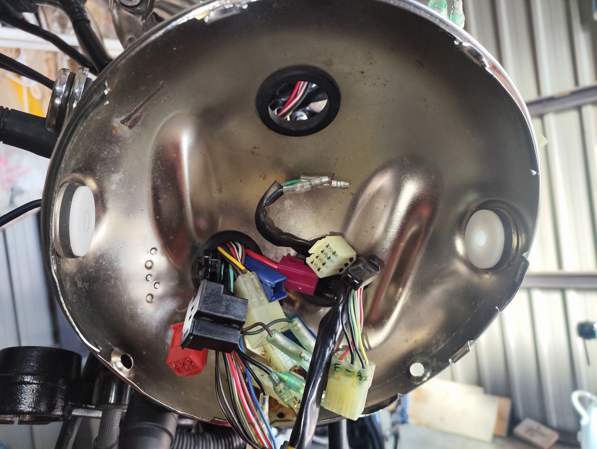 - 最初にヘッドライトボディ―左下の穴にメインハーネス類をすべて通す