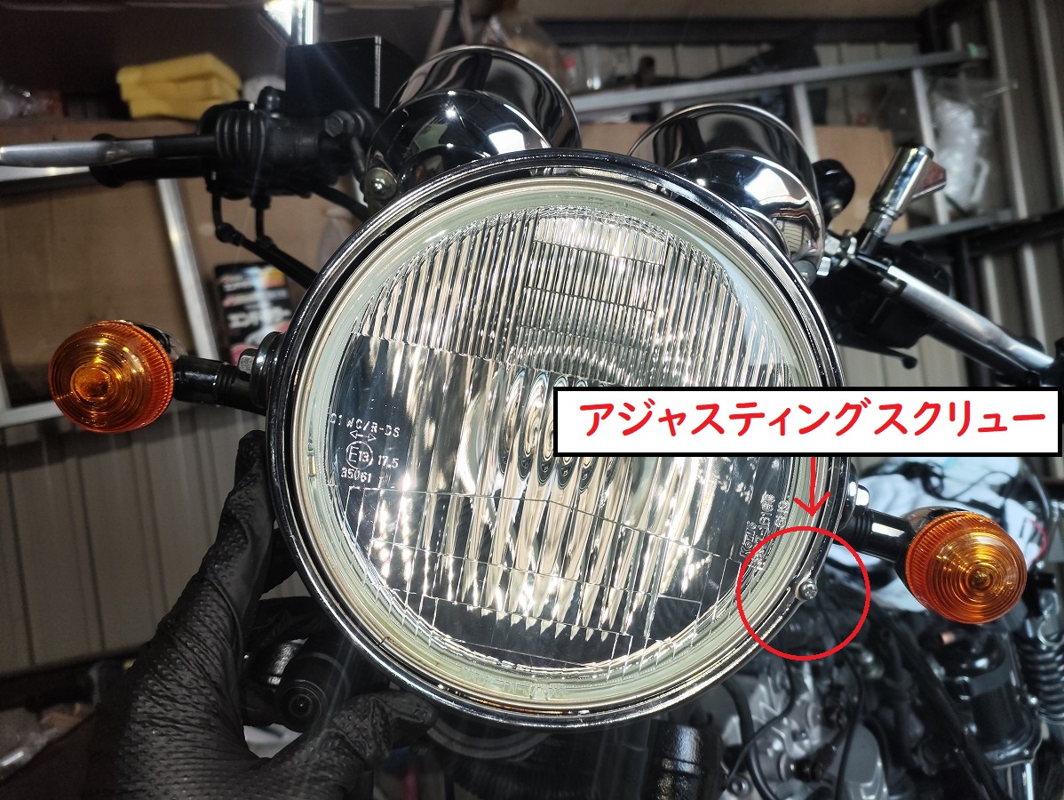 - ヘッドライトレンズ右下の アジャスティングスクリュー を回し、左右の照射角を調整する。