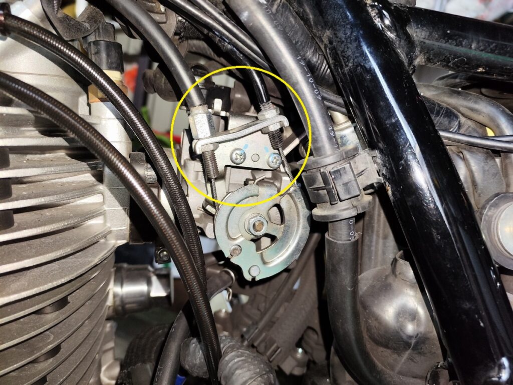 SR400には、スロットルワイヤーの遊び量を調整できる箇所が 2か所 あります。