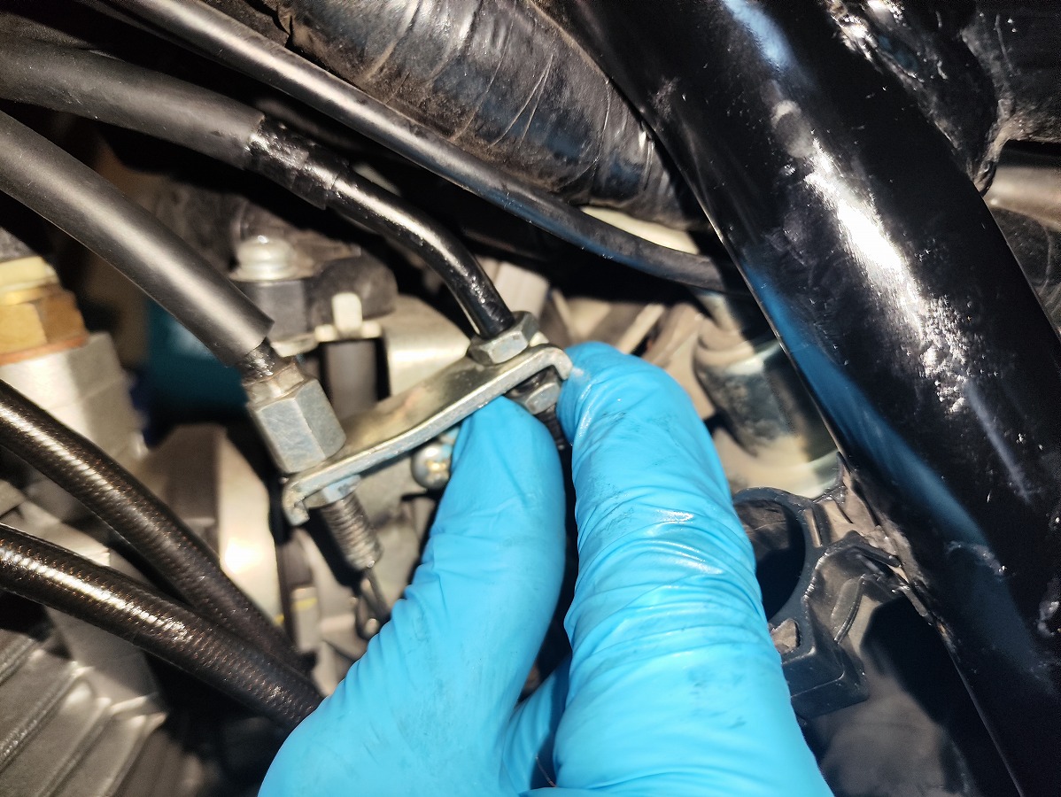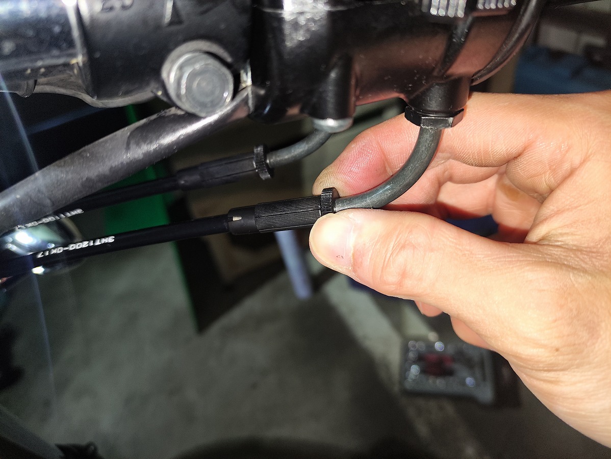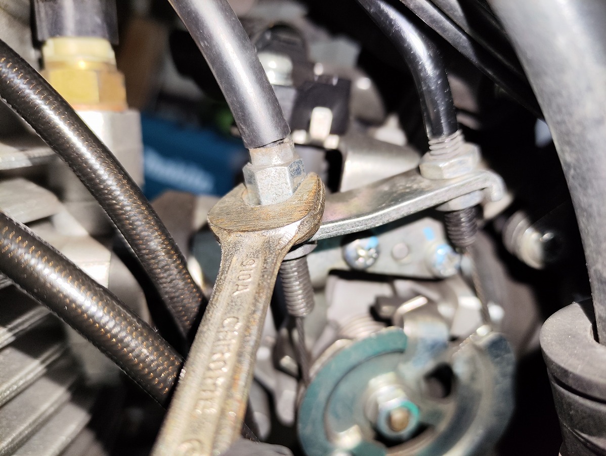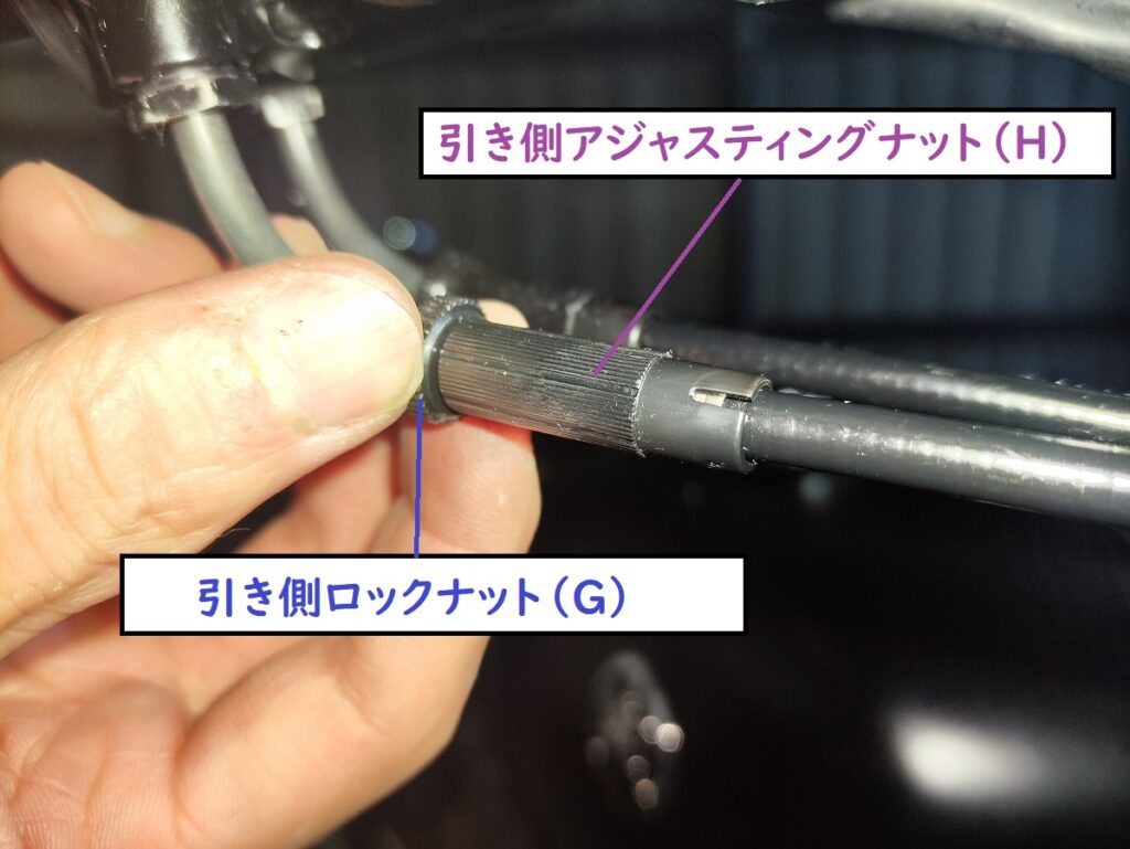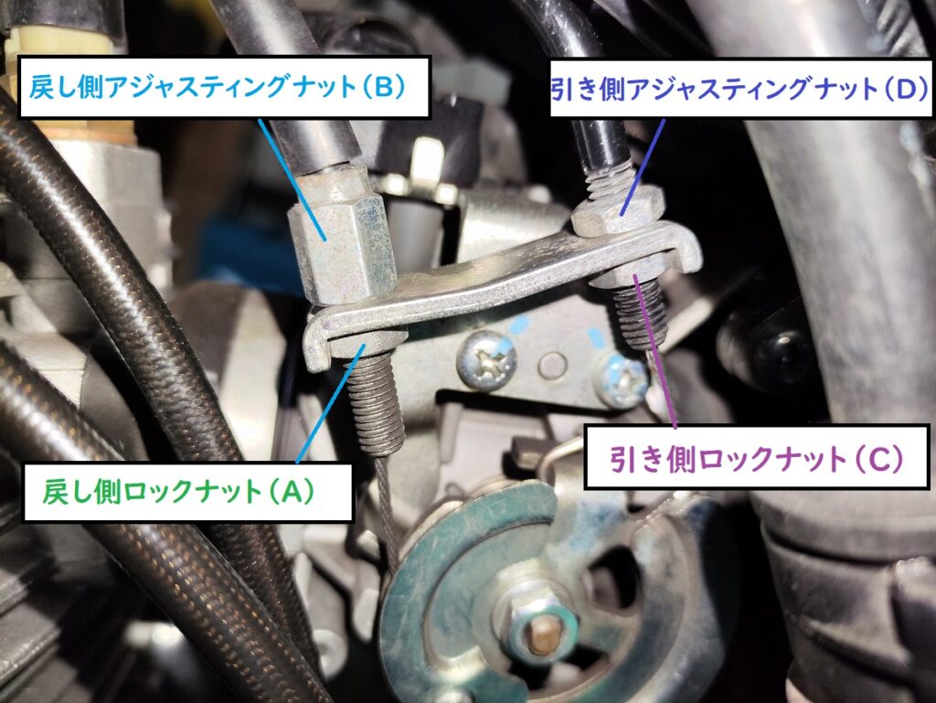 スロットルボディ側は、ケーブルホルダーにアジャスターとロックナットで固定されています。