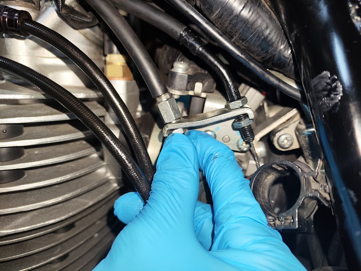 遊び調整の際、戻し側は必ずしも調整が必要な箇所ではありませんが、ワイヤーが伸びているとスロットルの戻りが悪くなったり、完全に戻り切らないといった不具合が発生することがあります。