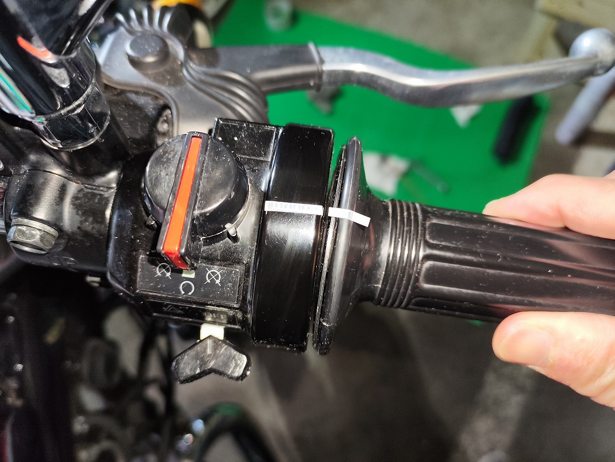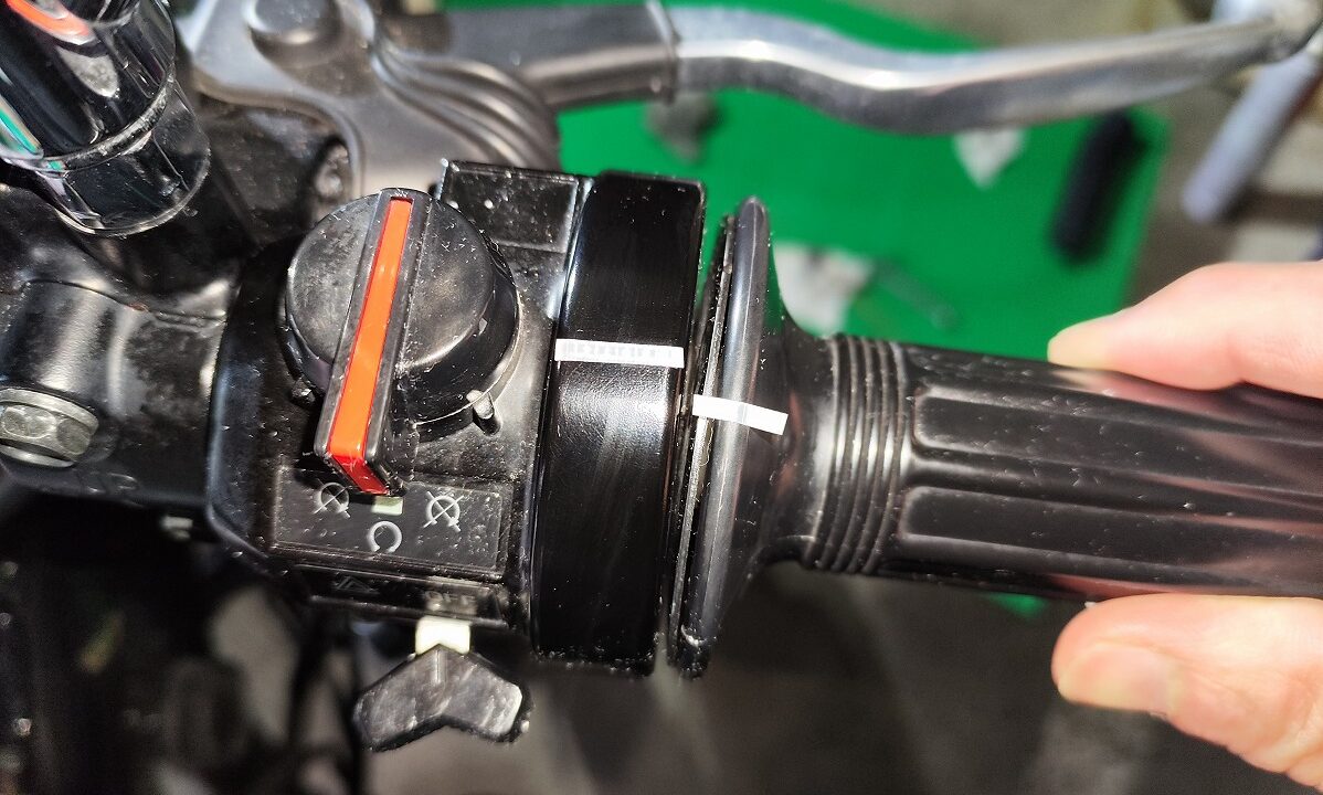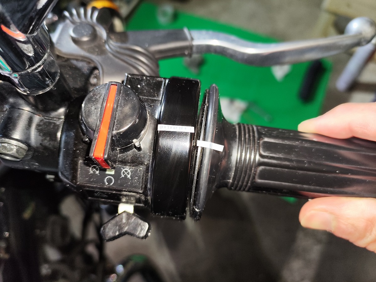 - その状態からスロットルグリップをゆっくり捻り、抵抗を感じ始めるまでの動き幅を測定する