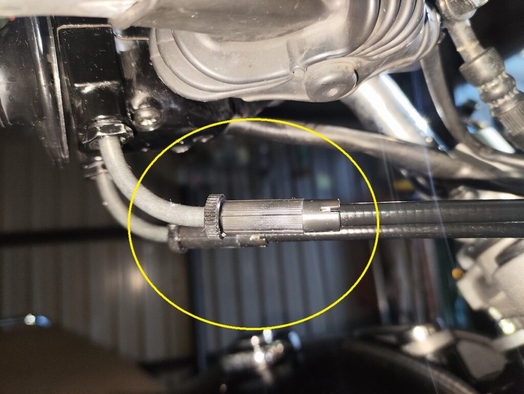 スロットルグリップ横にあるワイヤー調整部で、日常点検や微調整用の箇所 です。