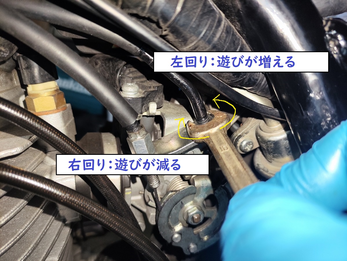 スロットル操作はワイヤーを介してエンジンに伝えられますが、使用を続けるうちにワイヤーは徐々に伸び、遊び量が変化していきます。