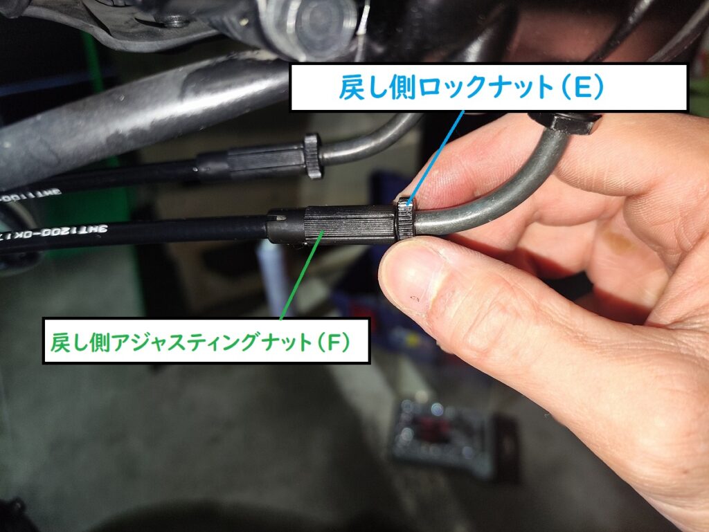 - アジャスティングナット(F)を回してスロットルボディ側の戻し側ワイヤーにたるみを調整する